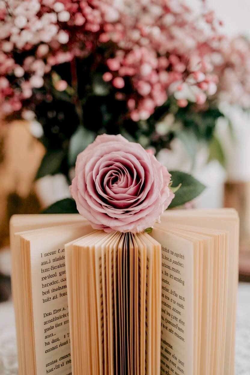 You can fold the pages of an open book inward to create a textured resting place for a large pink garden rose.