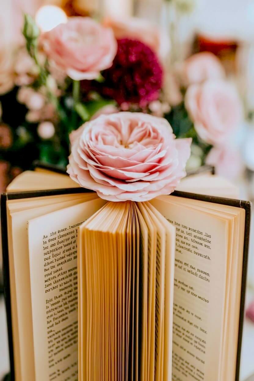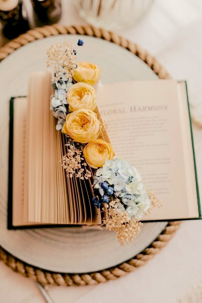 Tucking fresh flowers along the edge of a fanned book creates a delicate, whimsical framing effect.