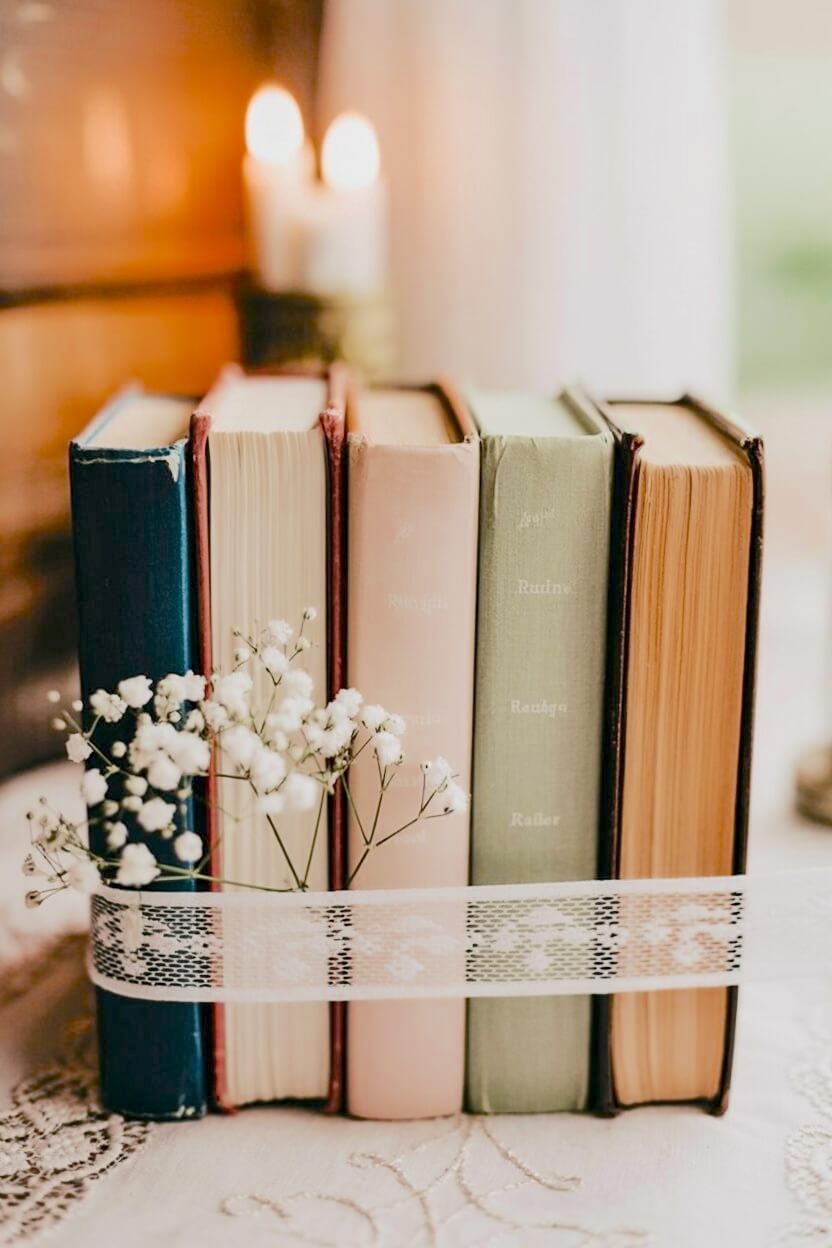Creating a soft, romantic tablescape is so easy when you start with a stack of vintage books. You can tie them together with a wide satin ribbon to give the arrangement a cohesive, intentional look. I love topping the stack with a lush cluster of pastel garden roses to soften the hard edges of the covers. This sweet design feels right at home for a spring brunch or a bridal shower.