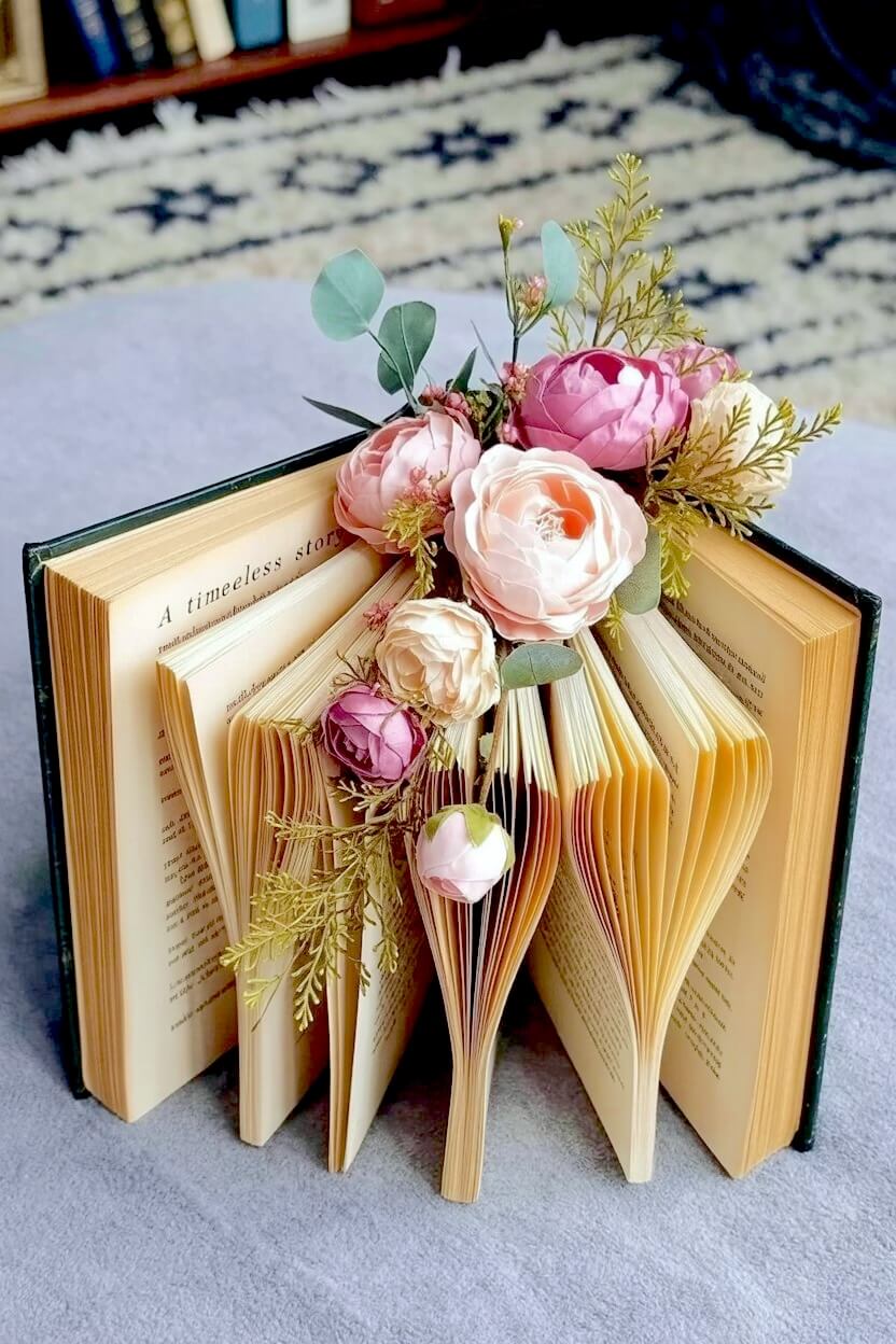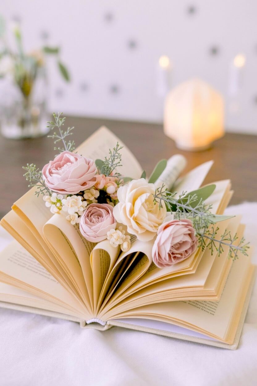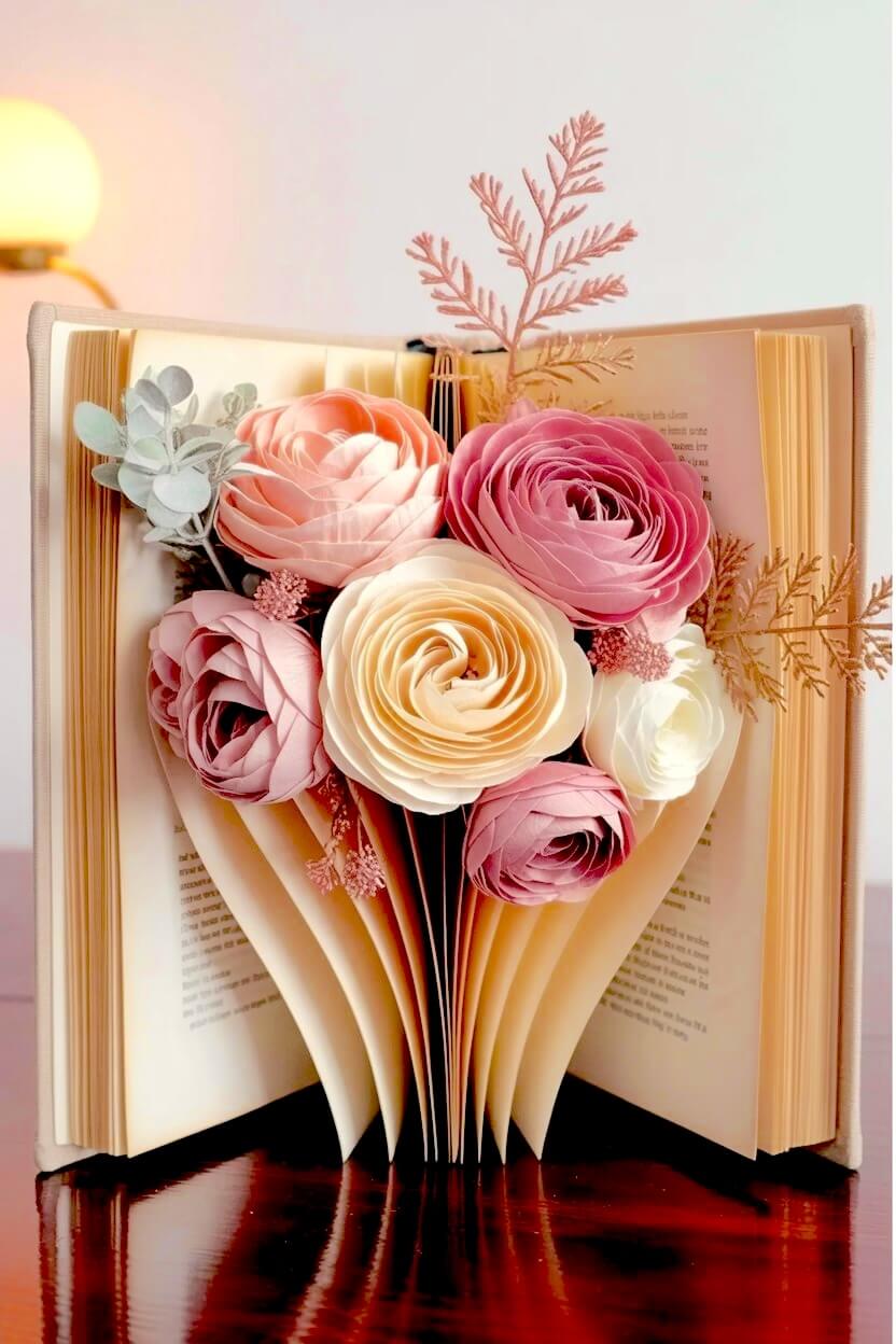 You can stand an open book upright and arrange oversized pink and peach paper roses to mimic a vibrant bouquet.