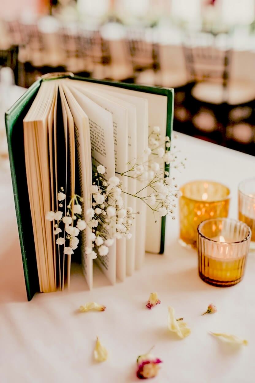 You can stand a green vintage book slightly open and weave sprigs of fresh baby’s breath throughout the pages.