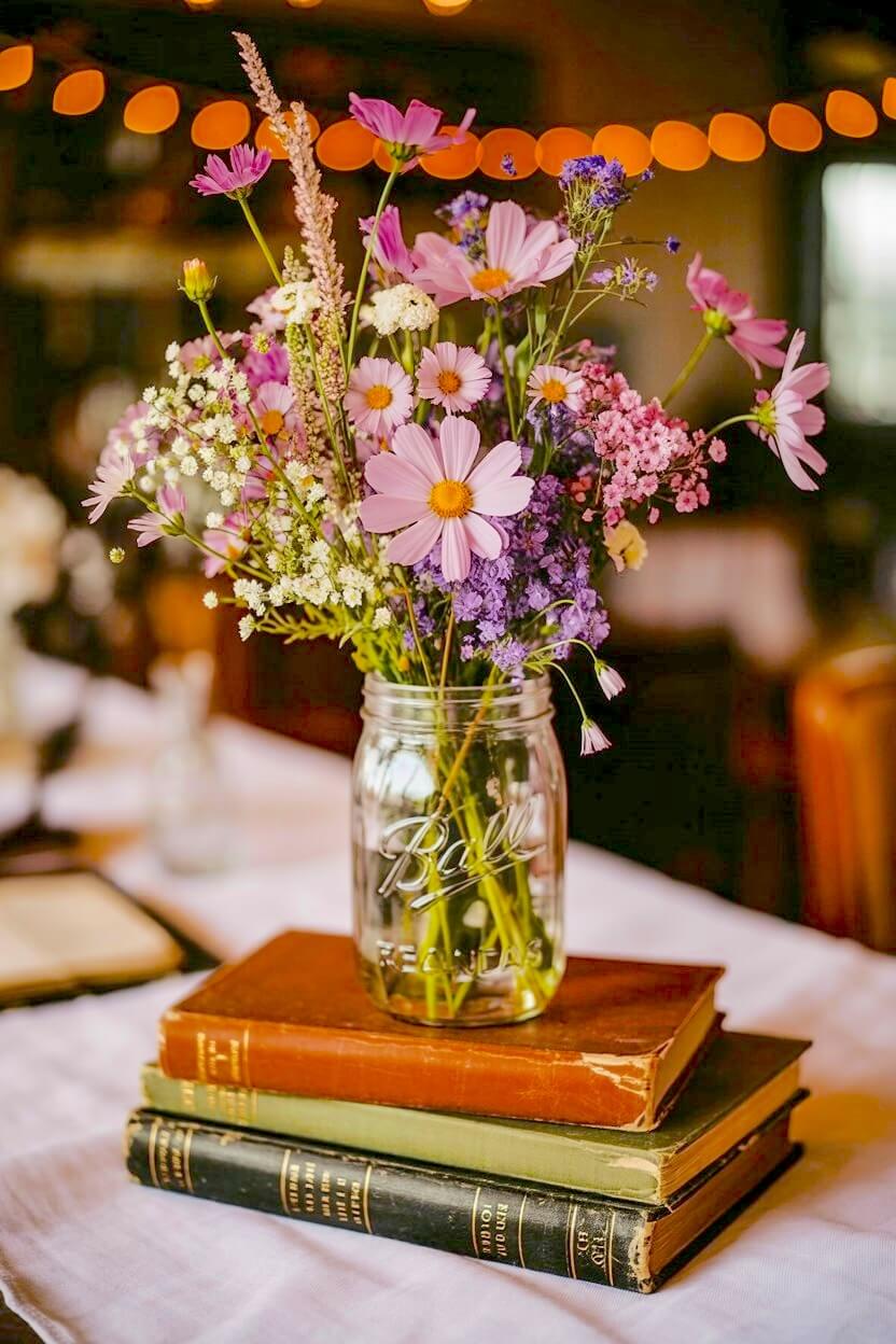 Pairing weathered hardcovers with a vintage mason jar creates a relaxed, farmhouse-inspired table setting.