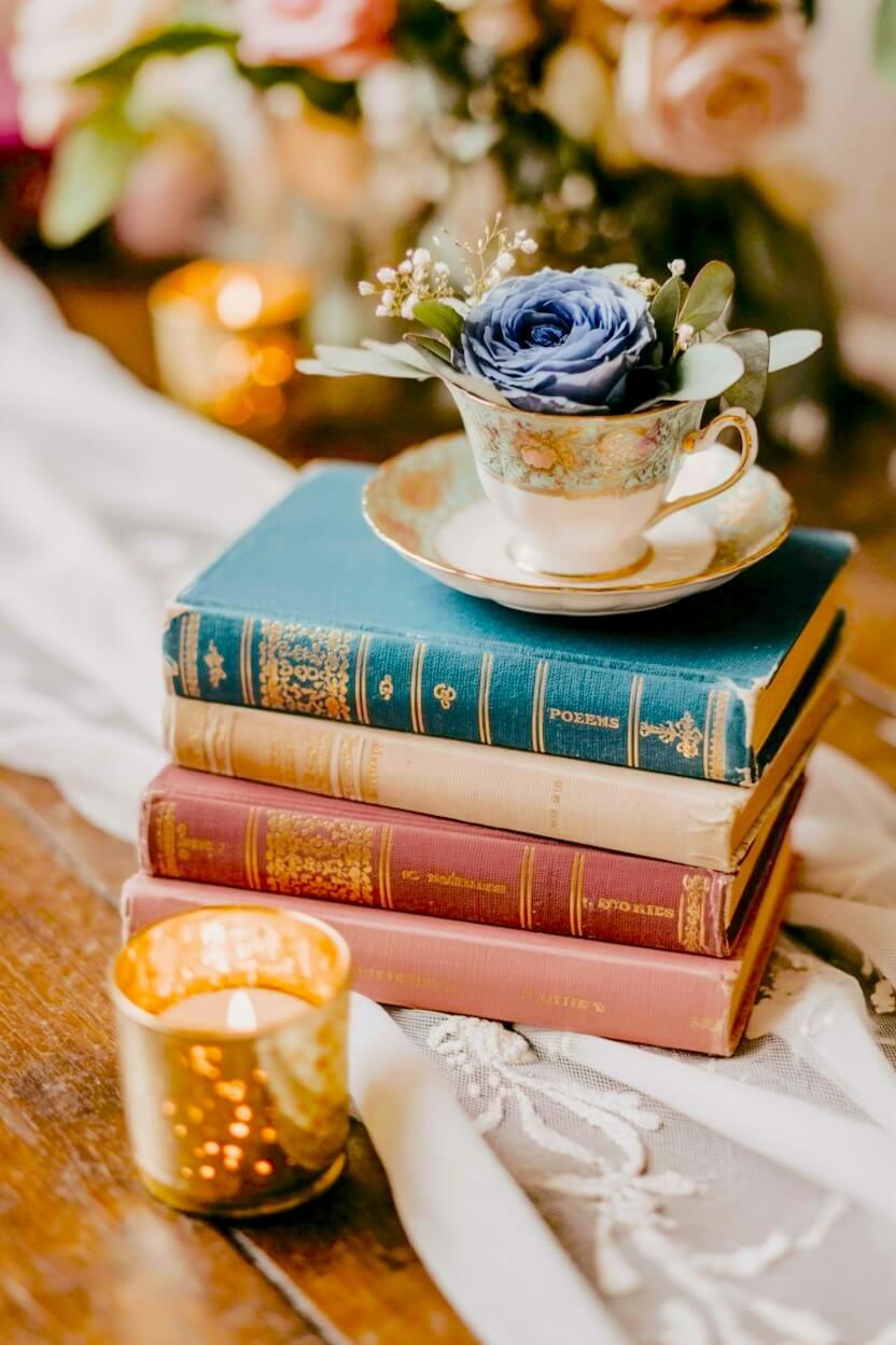 Vintage Teacup and Blue Rose Book Stack