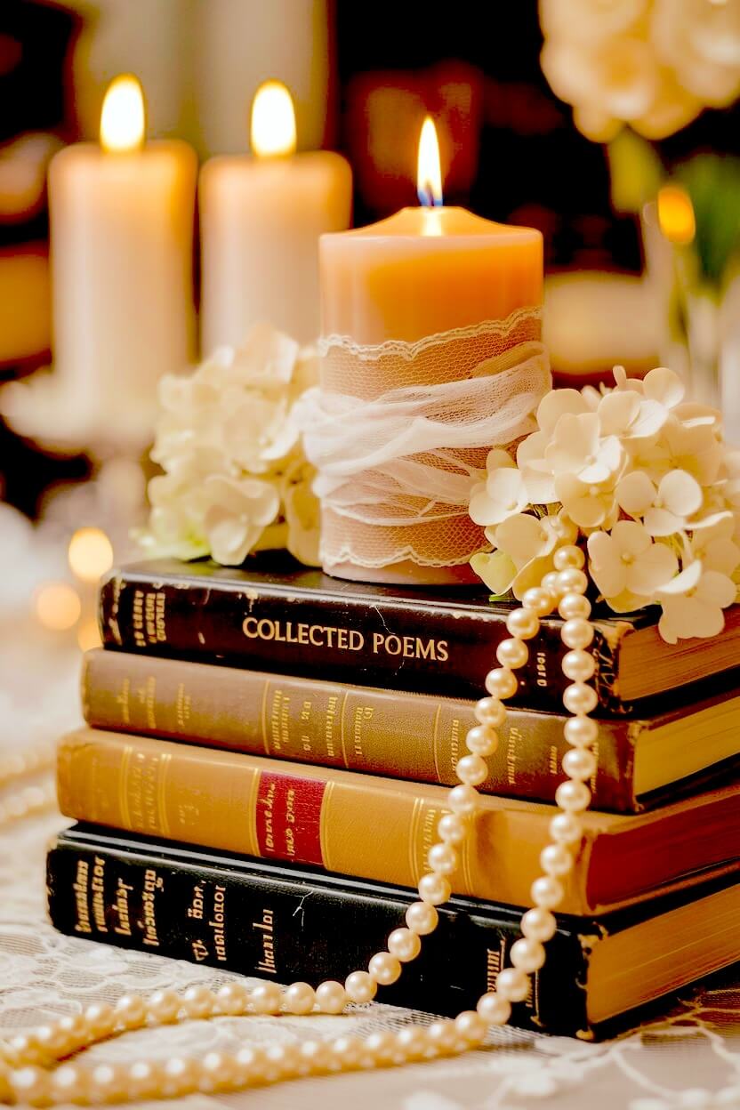 For a touch of old-world glamour, draping a strand of pearls across a stack of dark poetry books works beautifully.