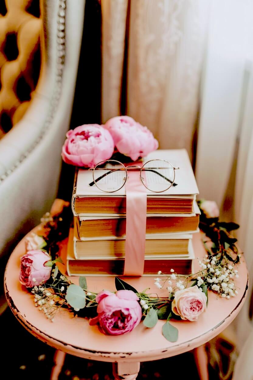 You can tie the books with a simple pink ribbon and lay a pair of wire-rimmed glasses on top for a charming, academic touch.