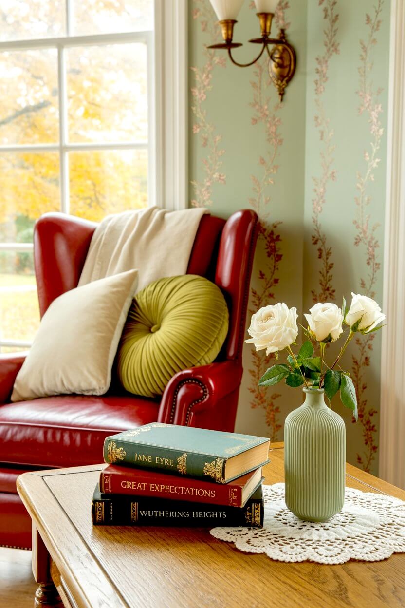 Don’t you love how the bold red leather stands out against the soft, sage-green floral walls?