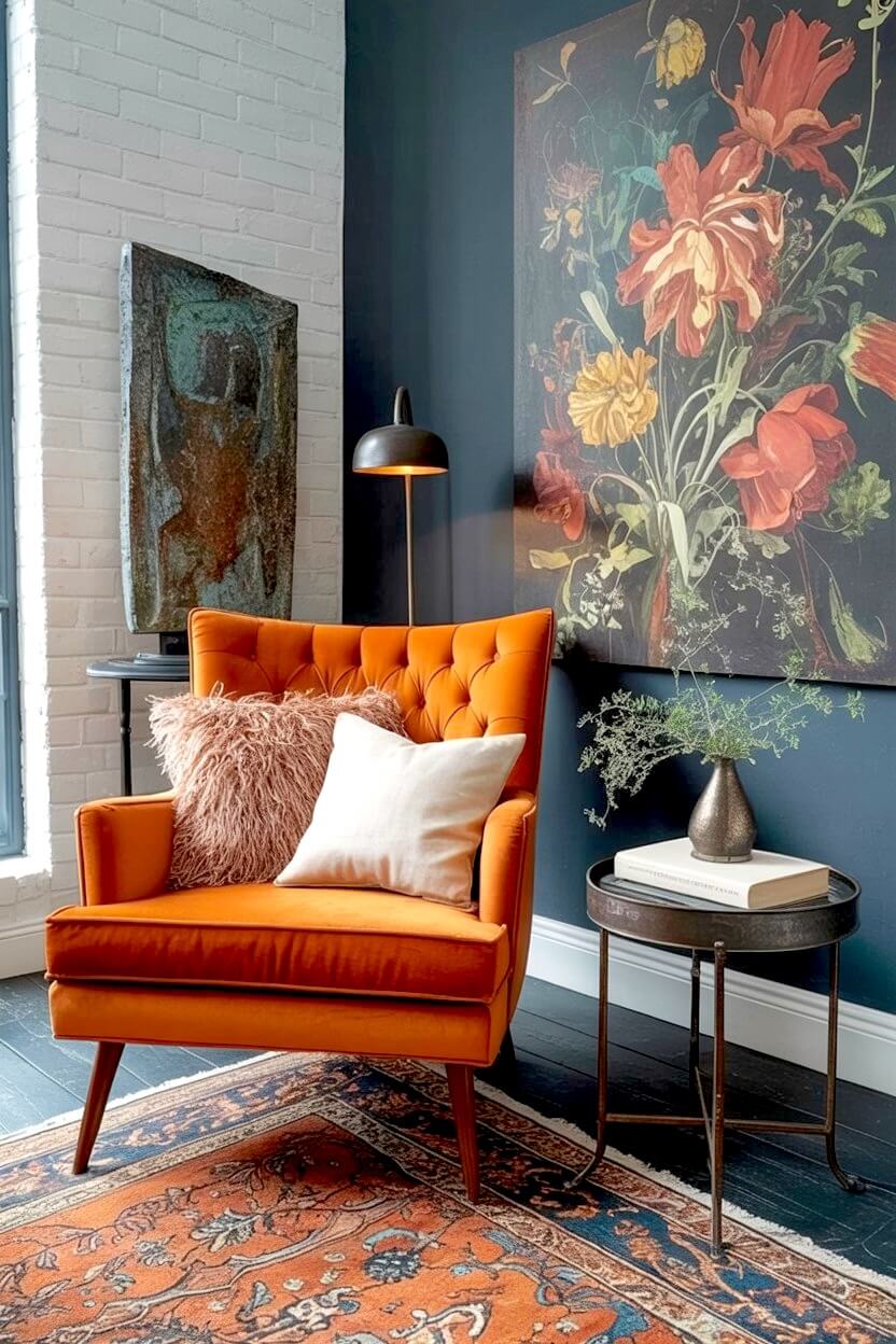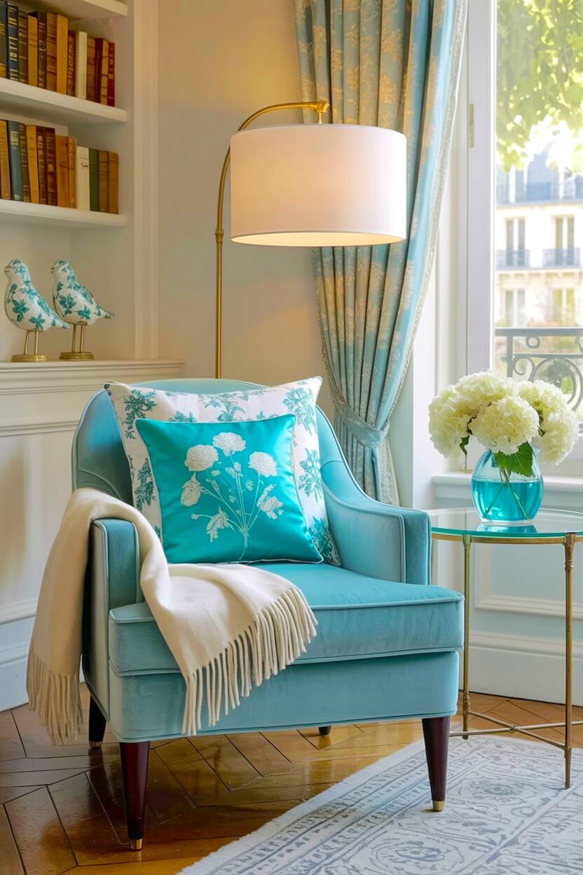 This vibrant seat, paired with a soft cream throw and a slim gold floor lamp, creates a high-end retreat right in your living room.