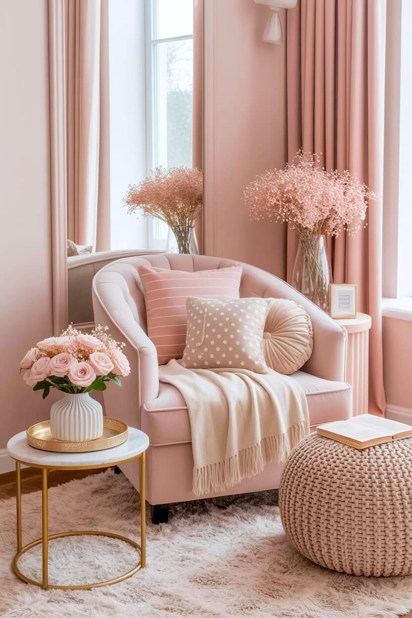 Sink into a total blush-toned dream with this monochromatic reading corner.