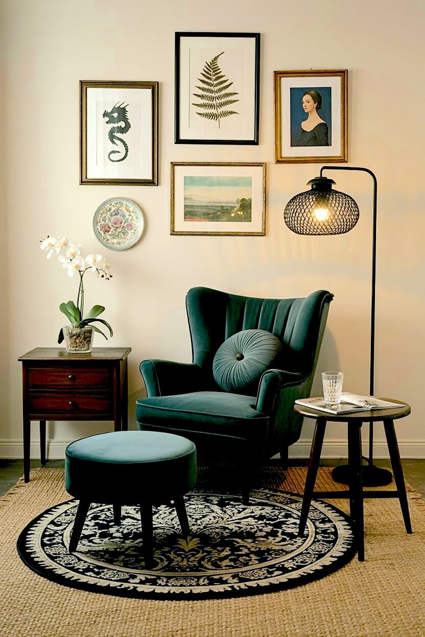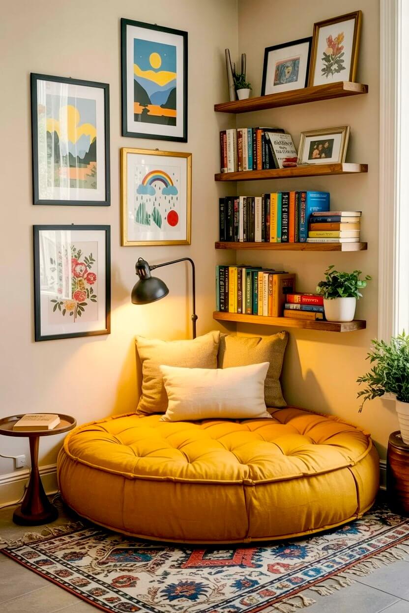 Pairing a plush floor seat with a mini gallery wall gives you “big library” energy without the bulk of heavy furniture