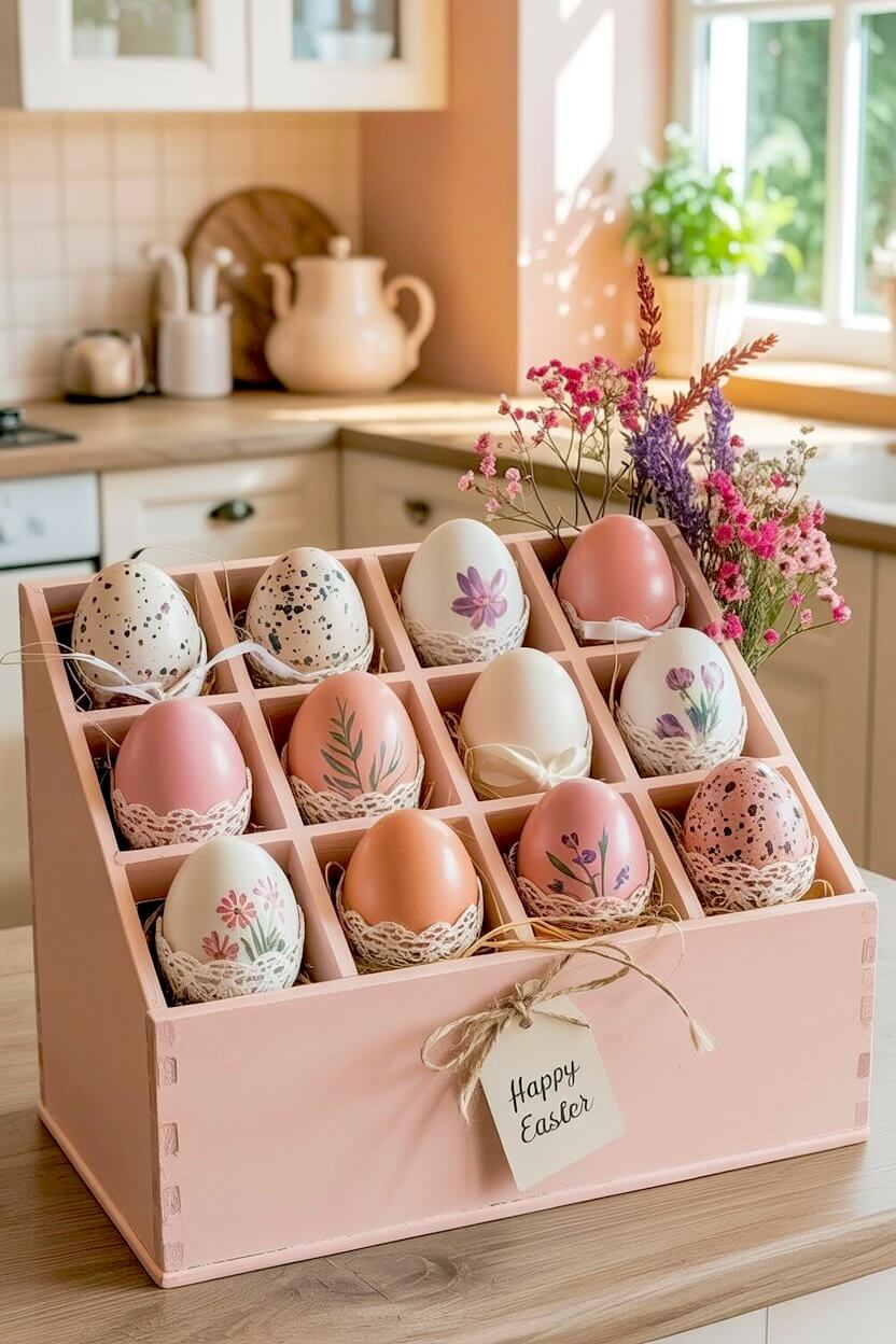 If you love a delicate, vintage-inspired touch, a pastel pink sorting crate is the perfect way to showcase your customized eggs.