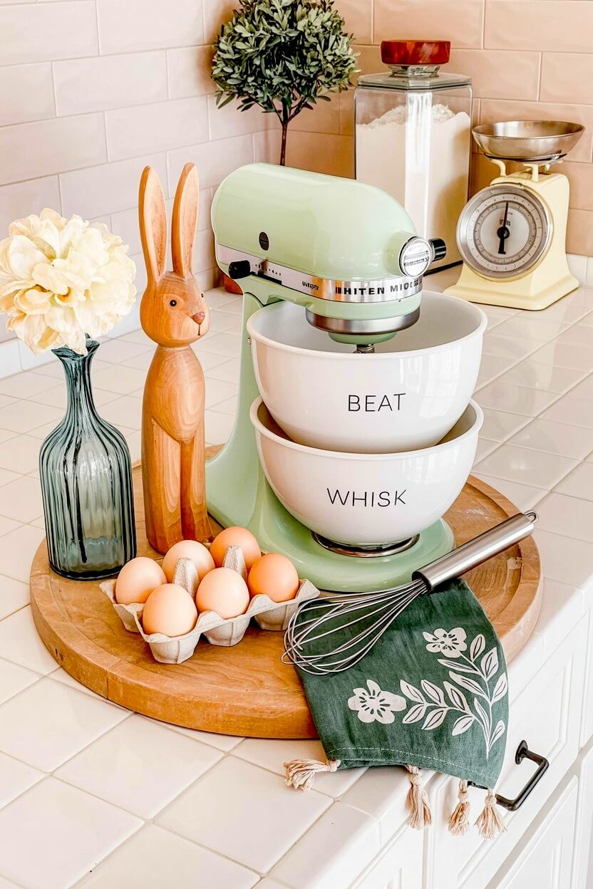 To bring in a nice earthy element, tuck a tall, carved wooden bunny next to your mixing bowls.