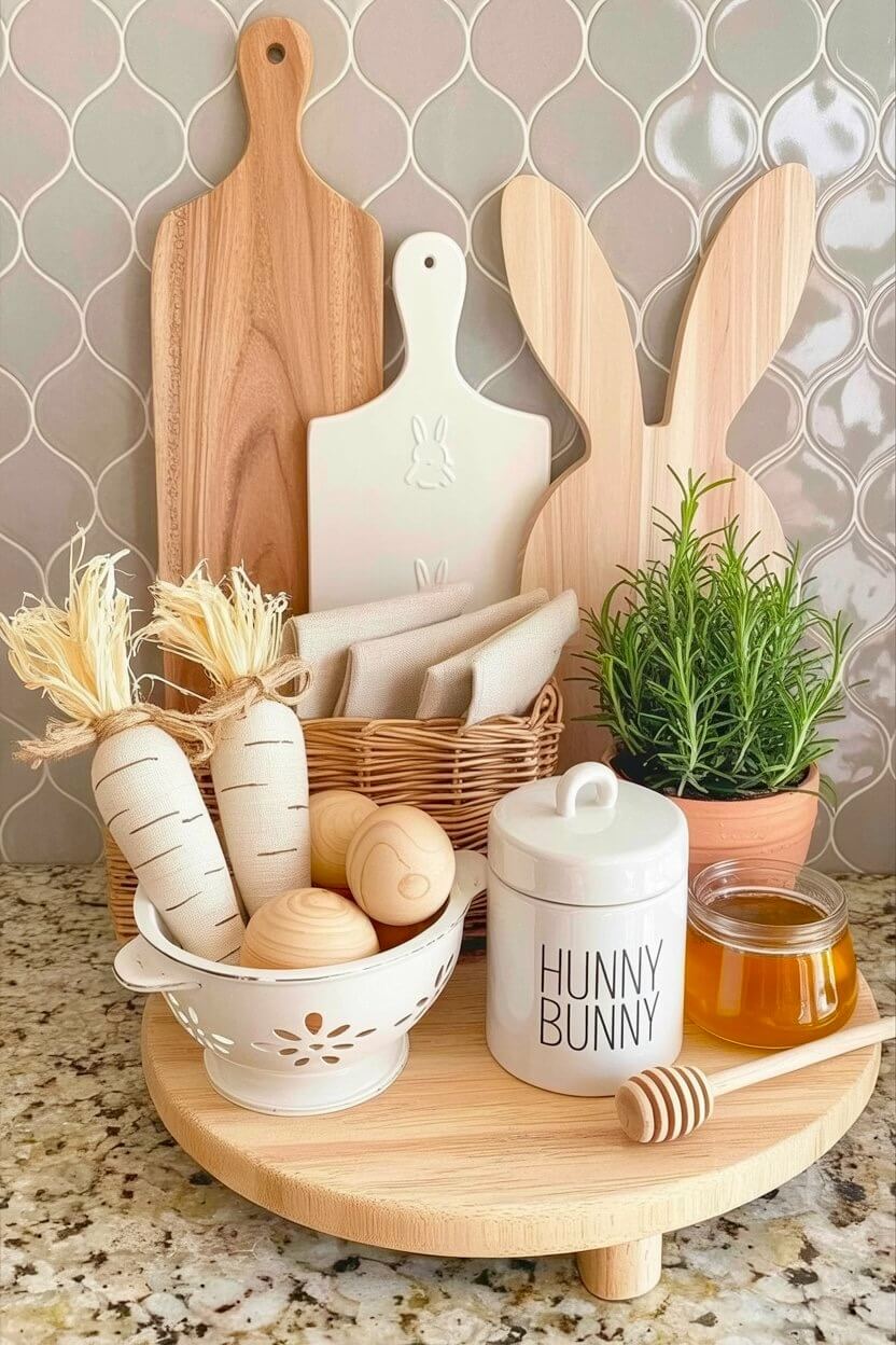 As a final touch, set a cute “Hunny Bunny” ceramic jar beside a pot of honey.