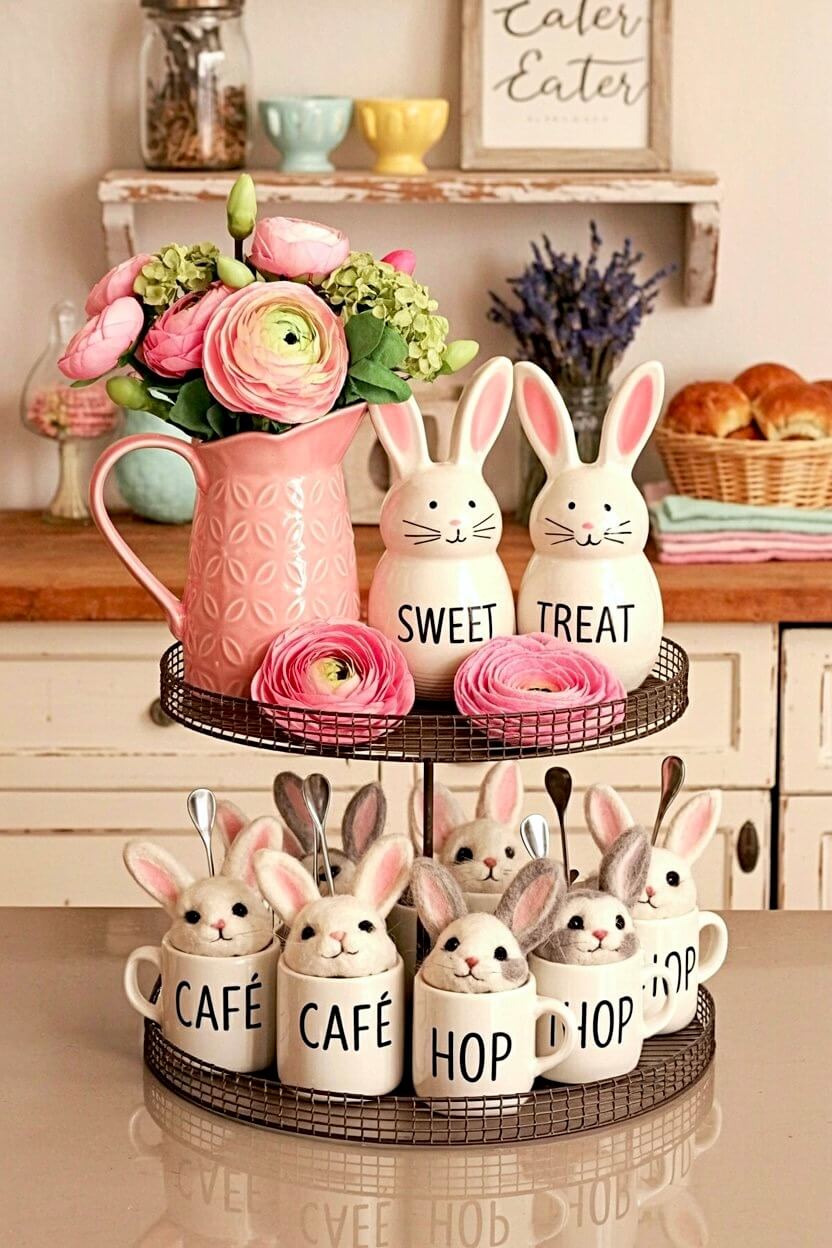 Meanwhile, line the bottom tier with small espresso mugs holding adorable felt bunny heads to add a clever detail.