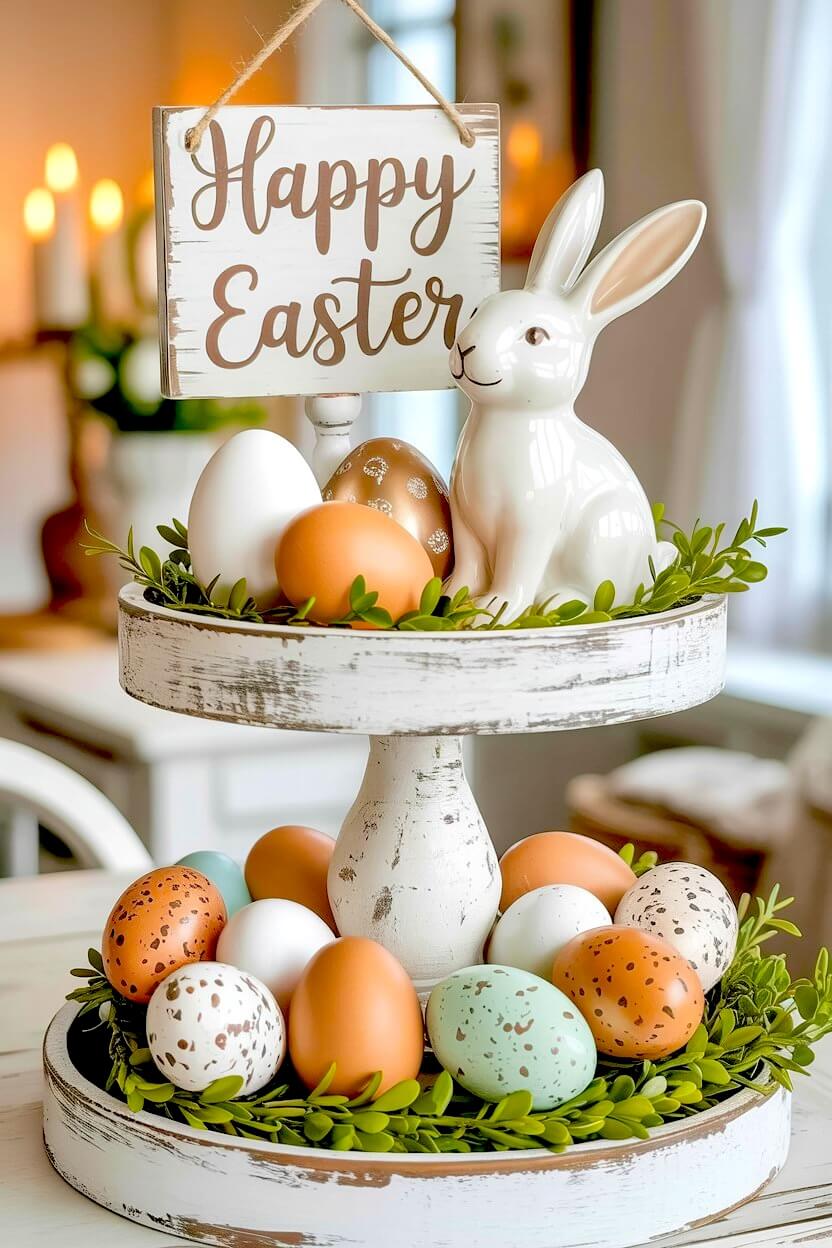 Adding a simple wooden sign and a glossy ceramic bunny creates a sweet focal point that draws the eye right in.