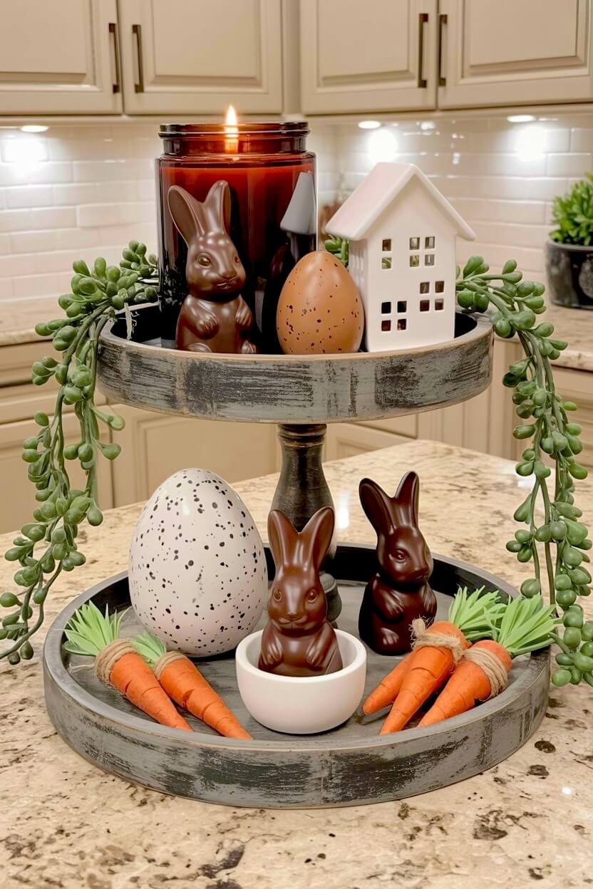 Using a rich, dark stained wood base anchors the glossy ceramic bunnies that look just like real chocolate treats.