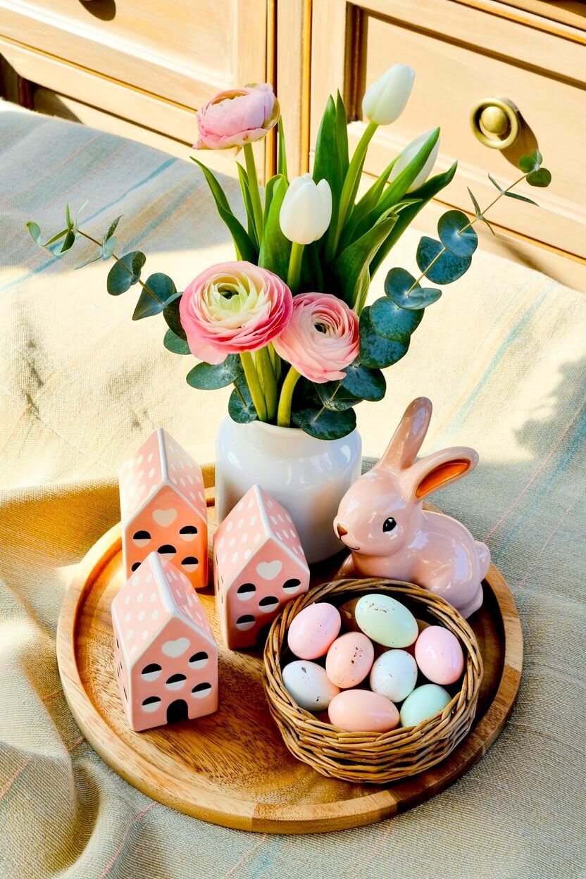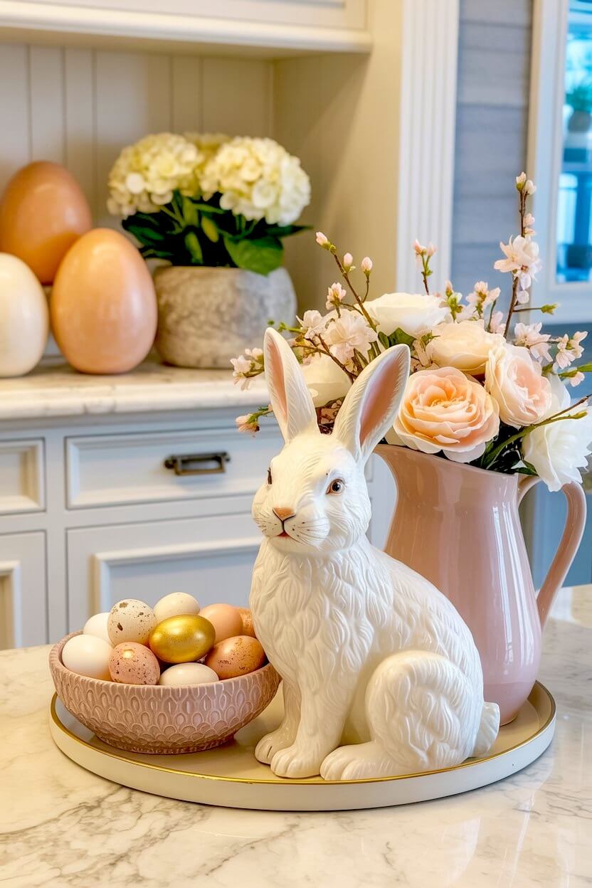 A grand ceramic bunny paired with a soft pink pitcher creates an undeniably cheerful focal point.