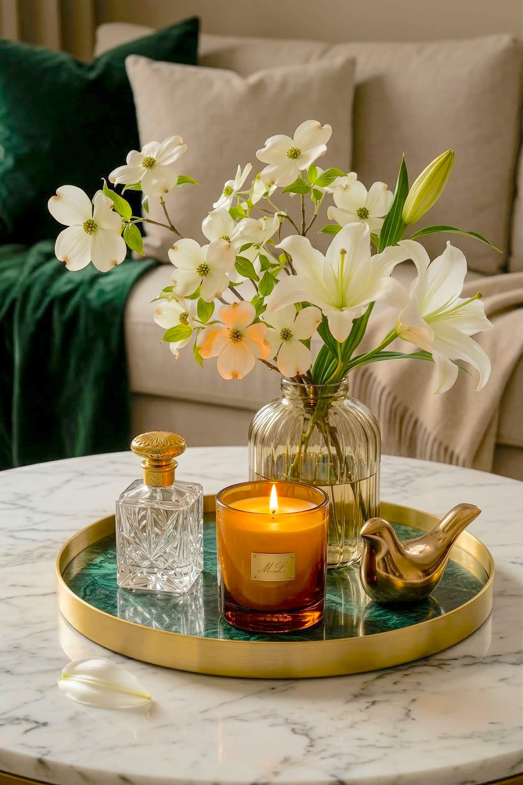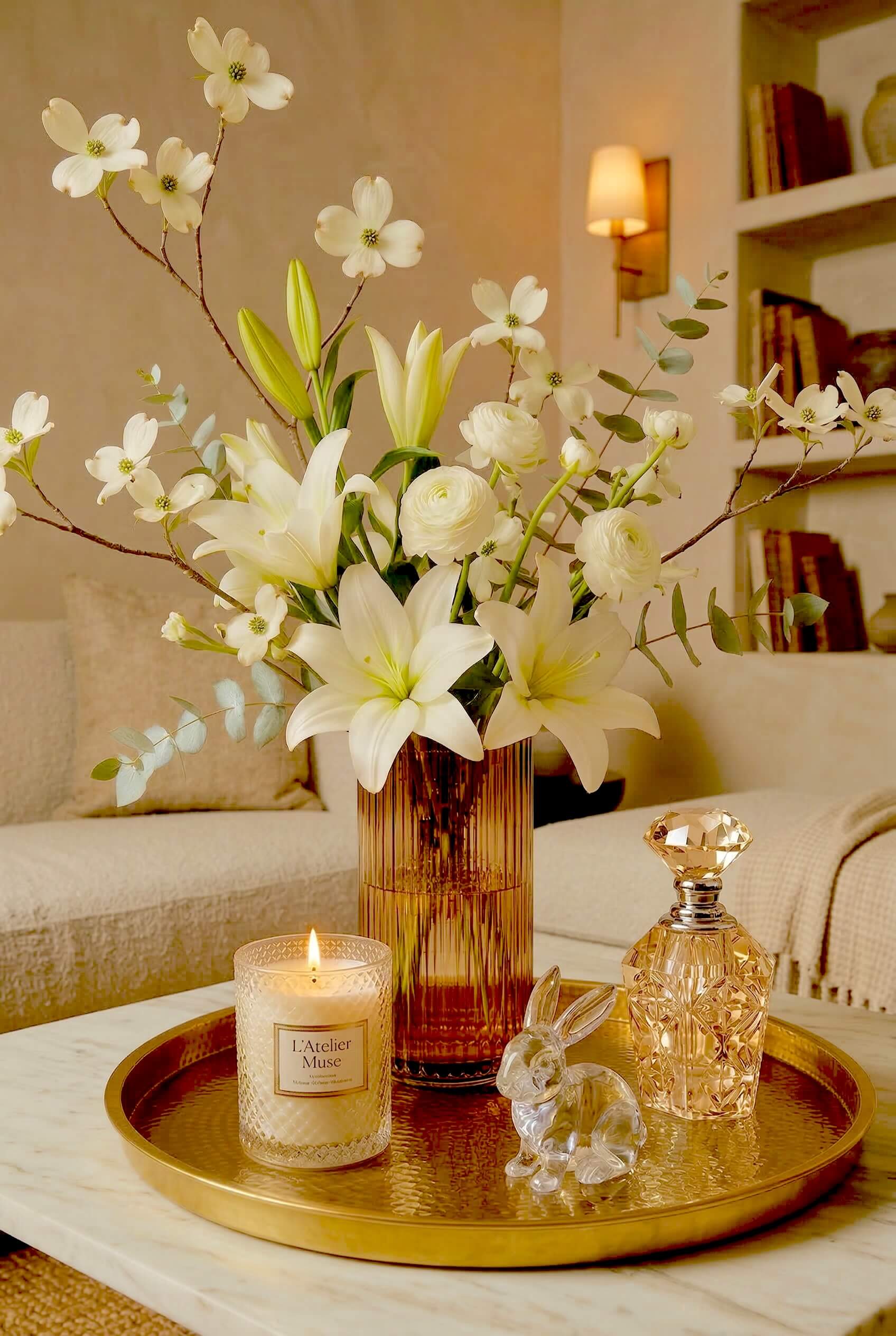 A crisp white marble tray provides the ultimate sophisticated foundation for spring blooms.