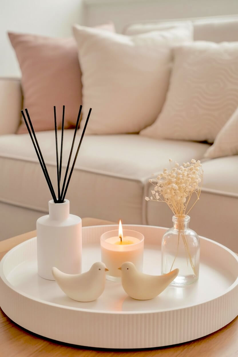 You can group a sleek white reed diffuser with a few delicate ceramic bird figurines for a peaceful moment.