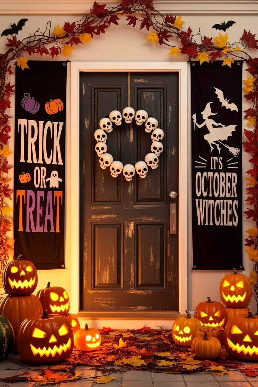 Okay, pumpkins are down, wreath is up — now let’s frame it with banners.