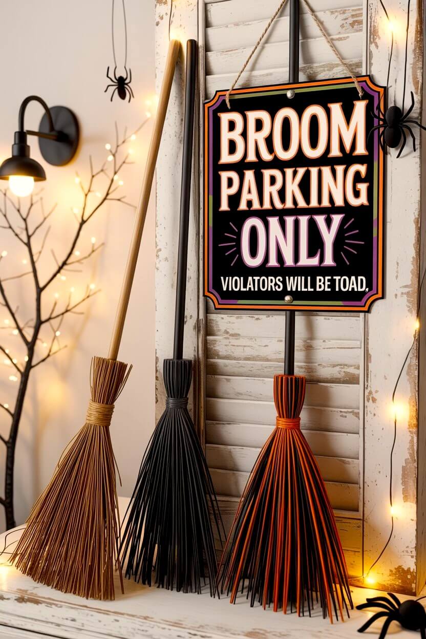 - Witches’ Brooms Parking Sign – A lighthearted touch. Perfect on the wall or railing, especially if you’ve already set out pumpkins nearby.