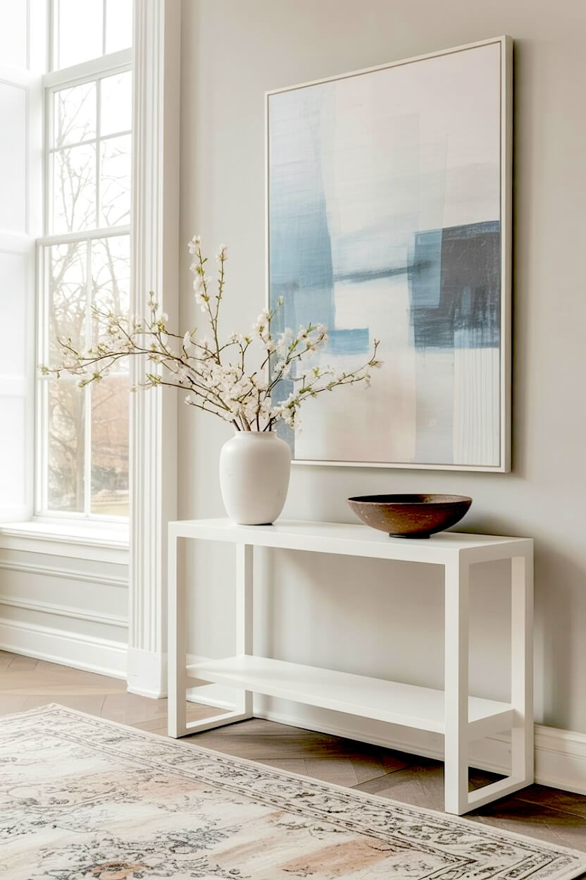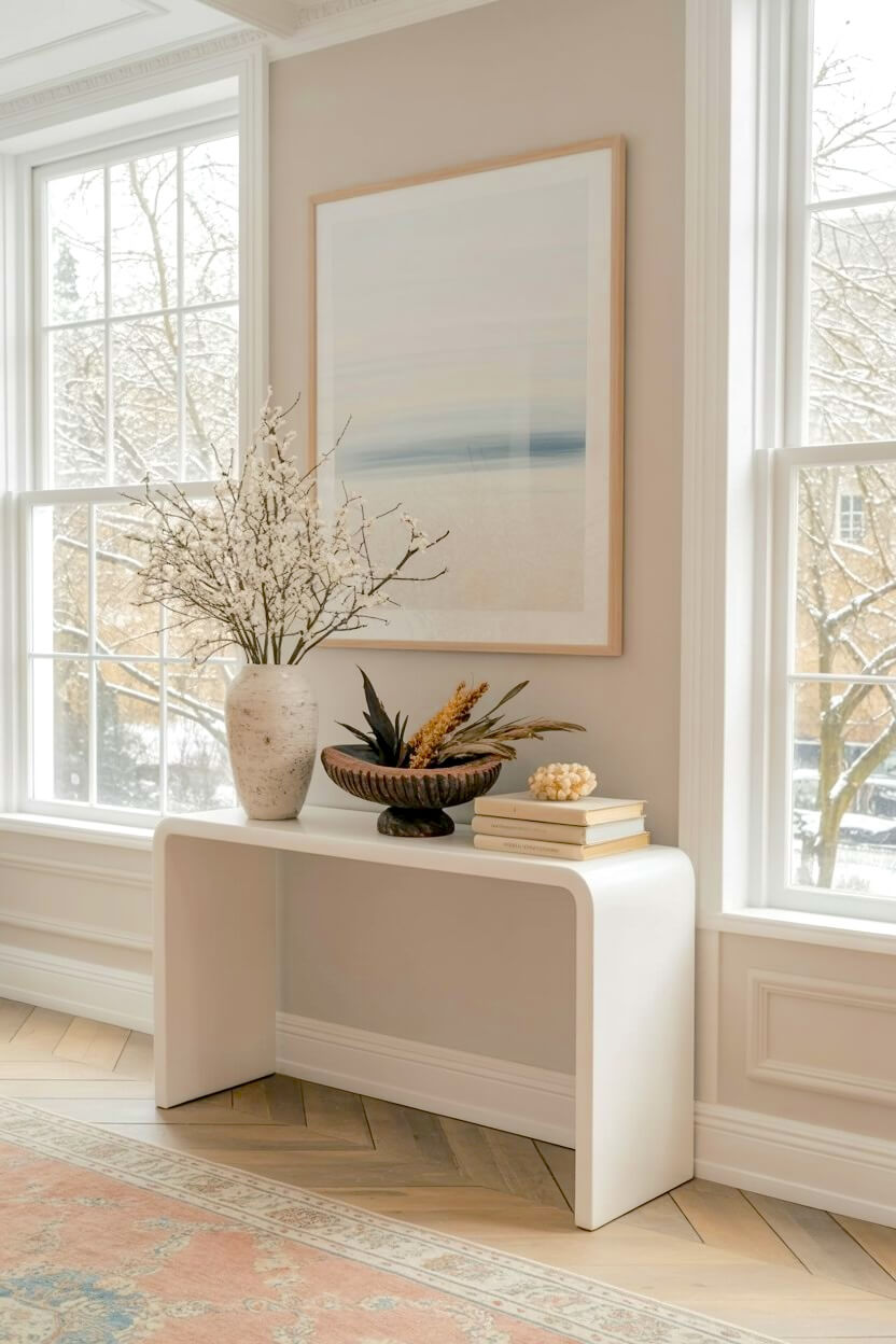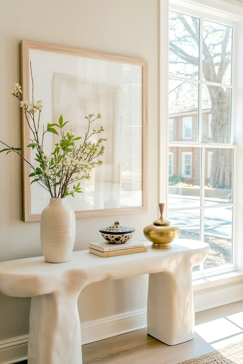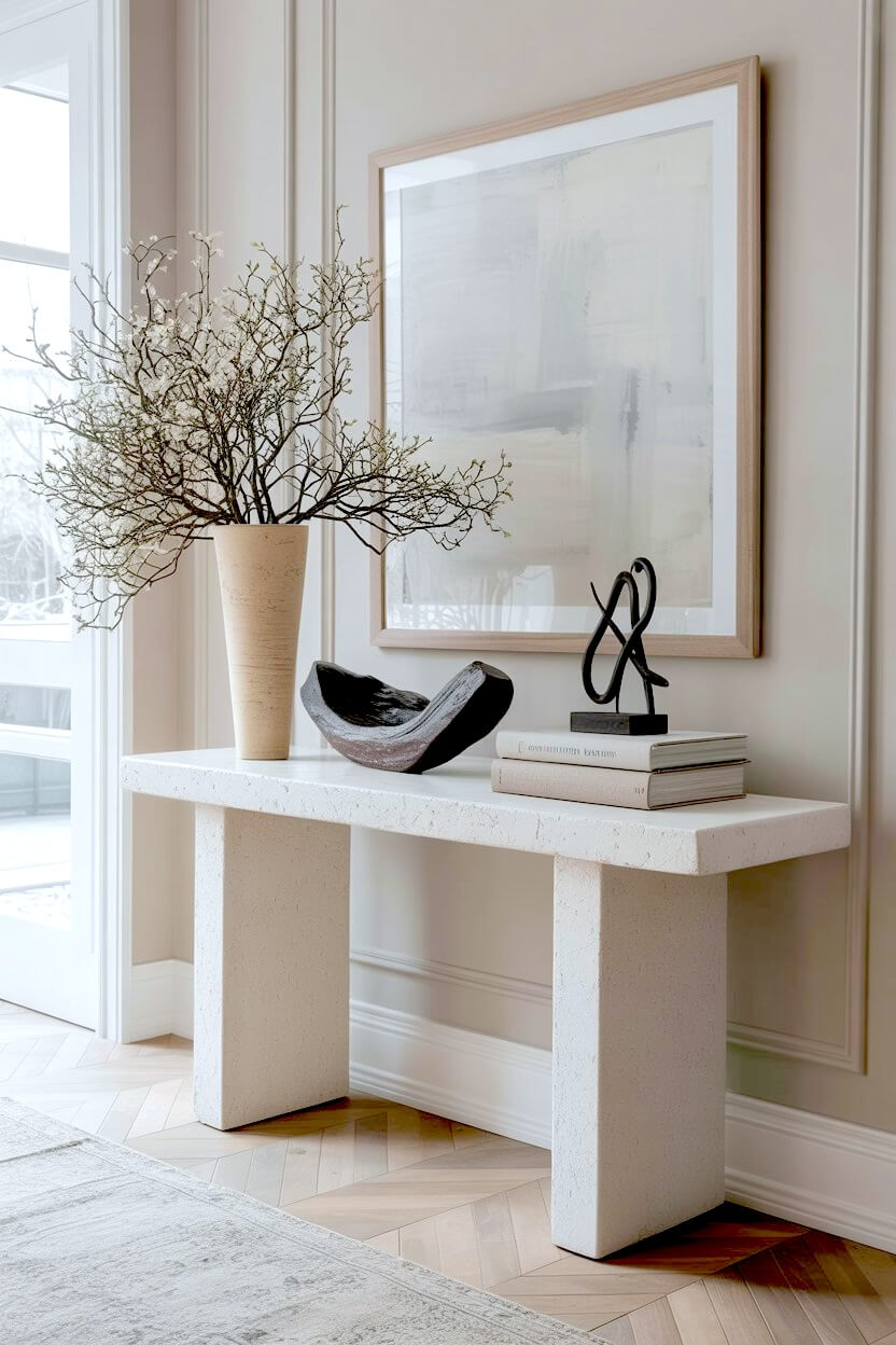 A chunky white table acts as a solid, earthy base for your entryway.