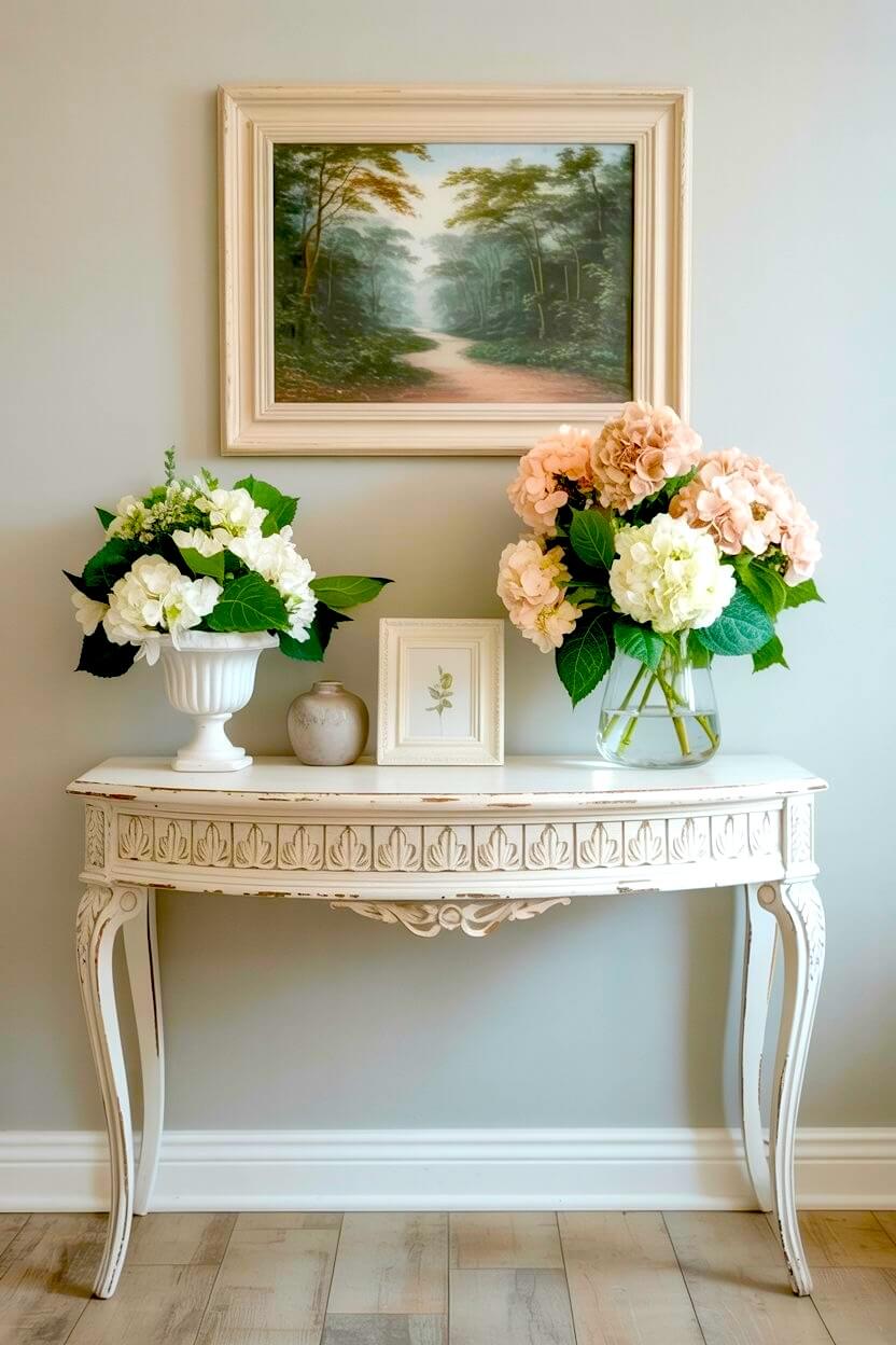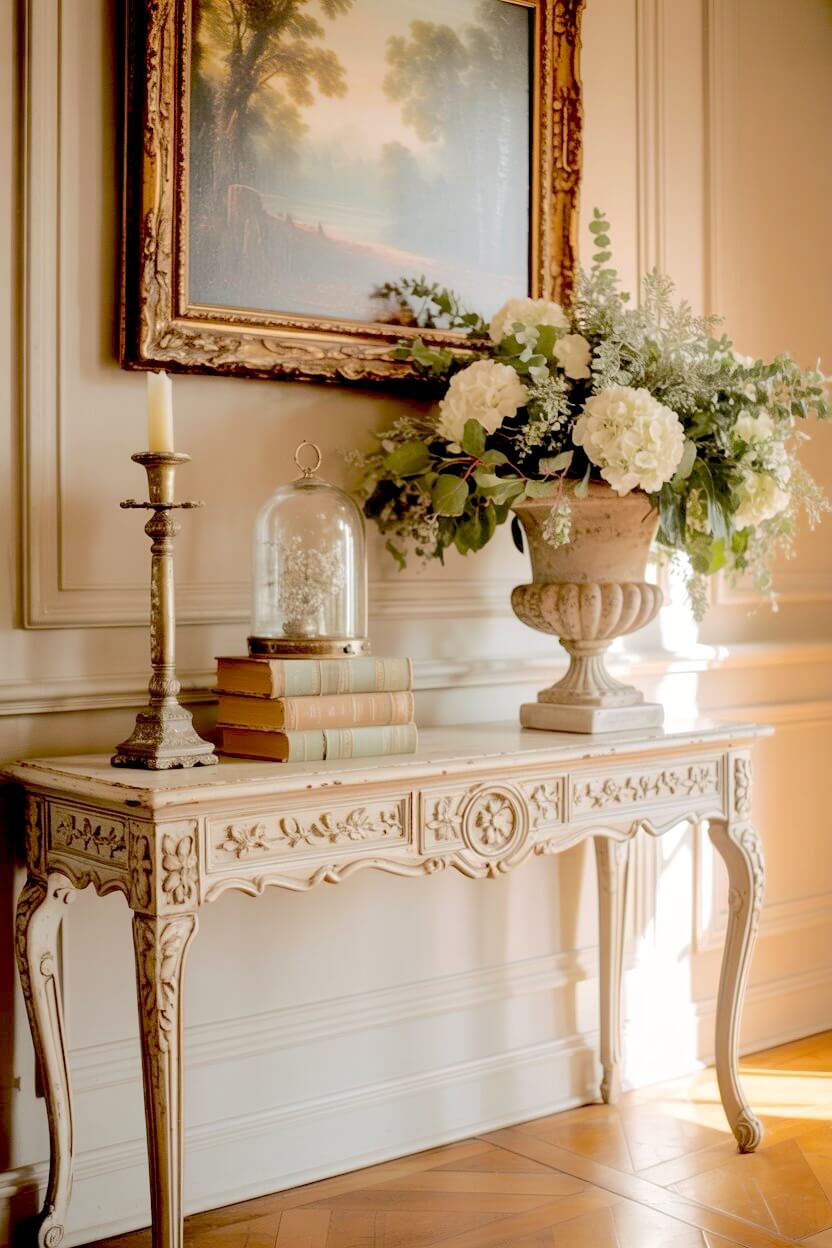 A carved provincial table brings elegant charm to your front door.