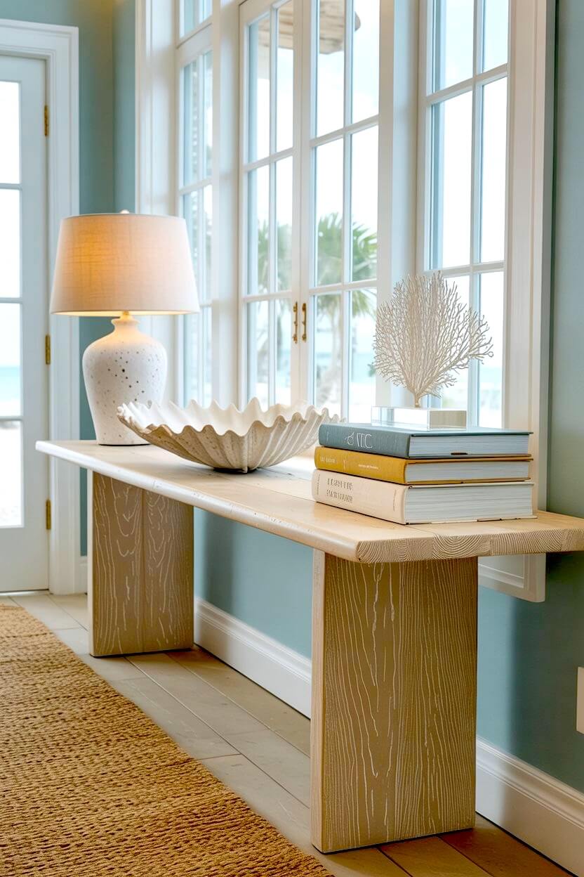 You can anchor a bright hallway with a light wood table and a textured ceramic lamp.