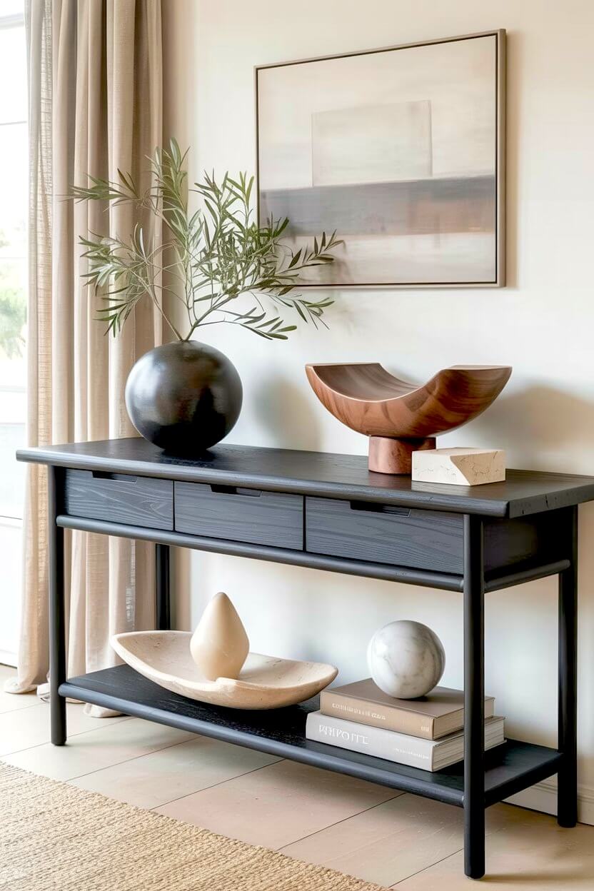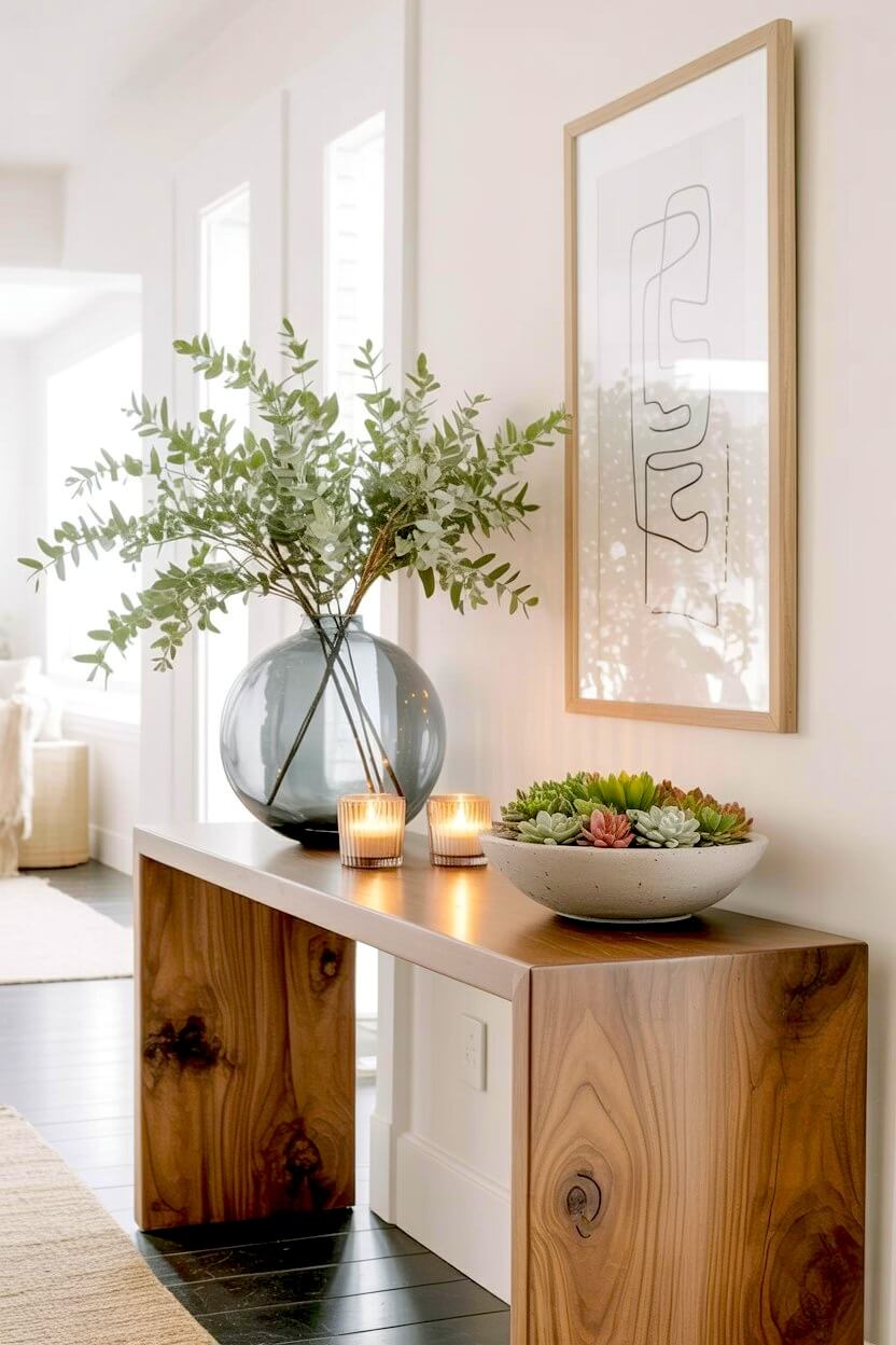 You can pair a light wood console with a heavily textured vase to create instant character.