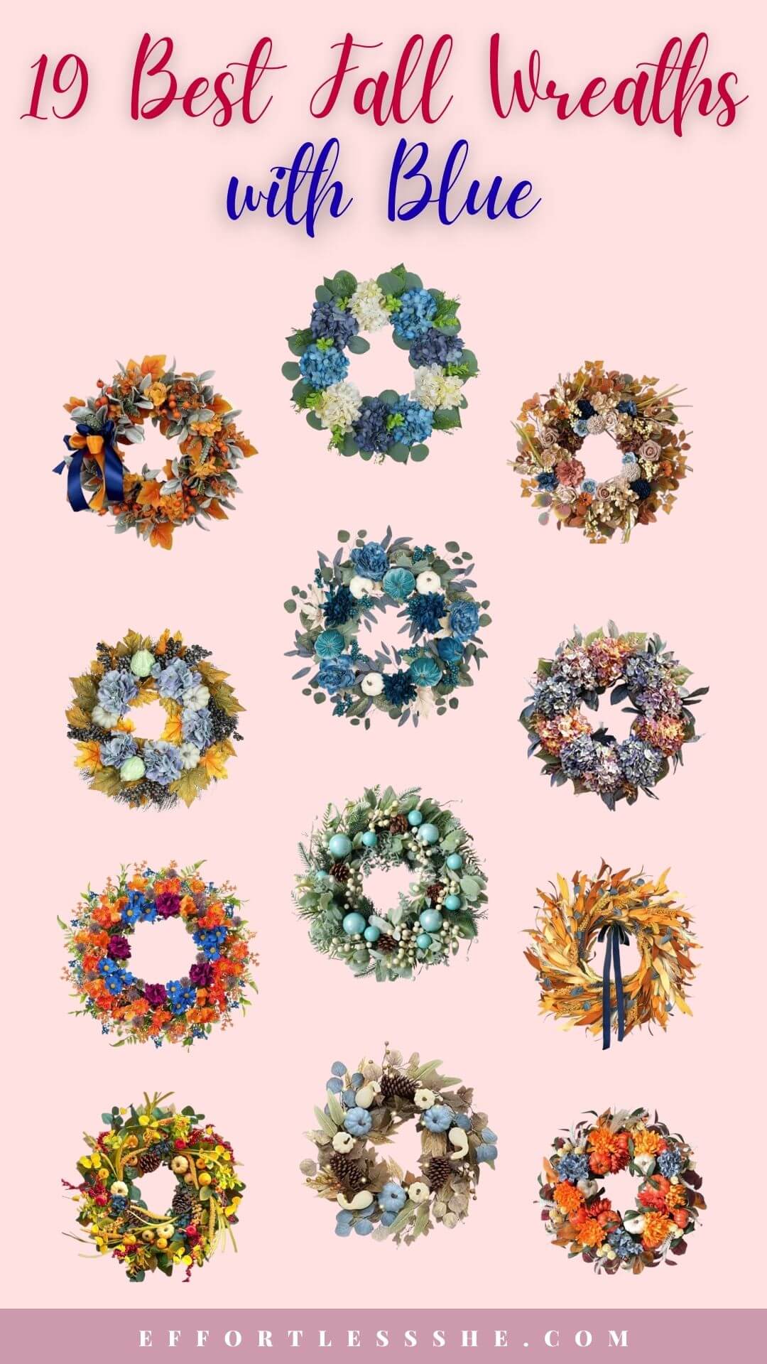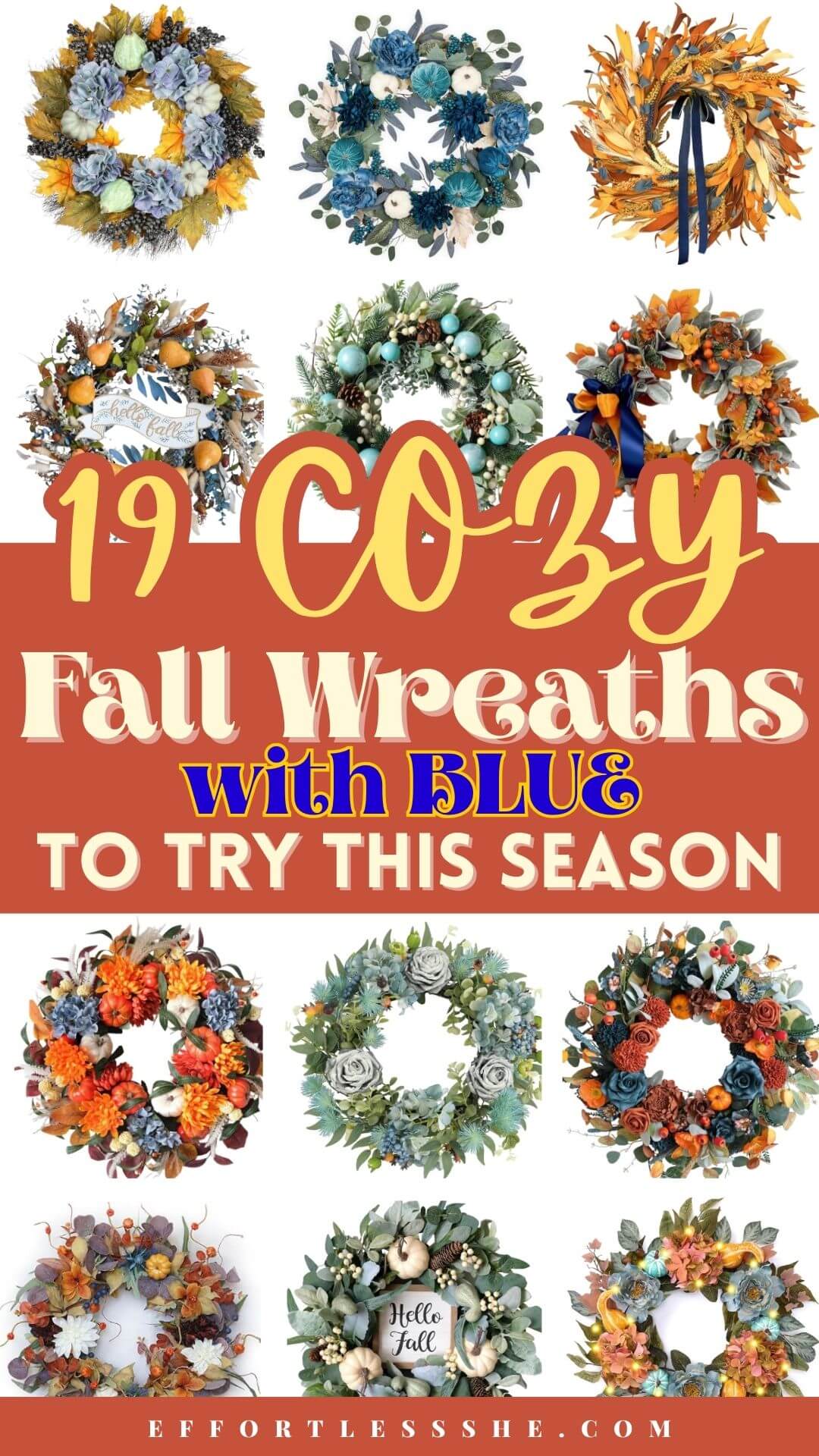This post shares 19+ stunning fall wreaths with blue to get your home ready for the season instantly.