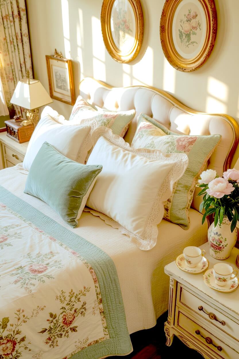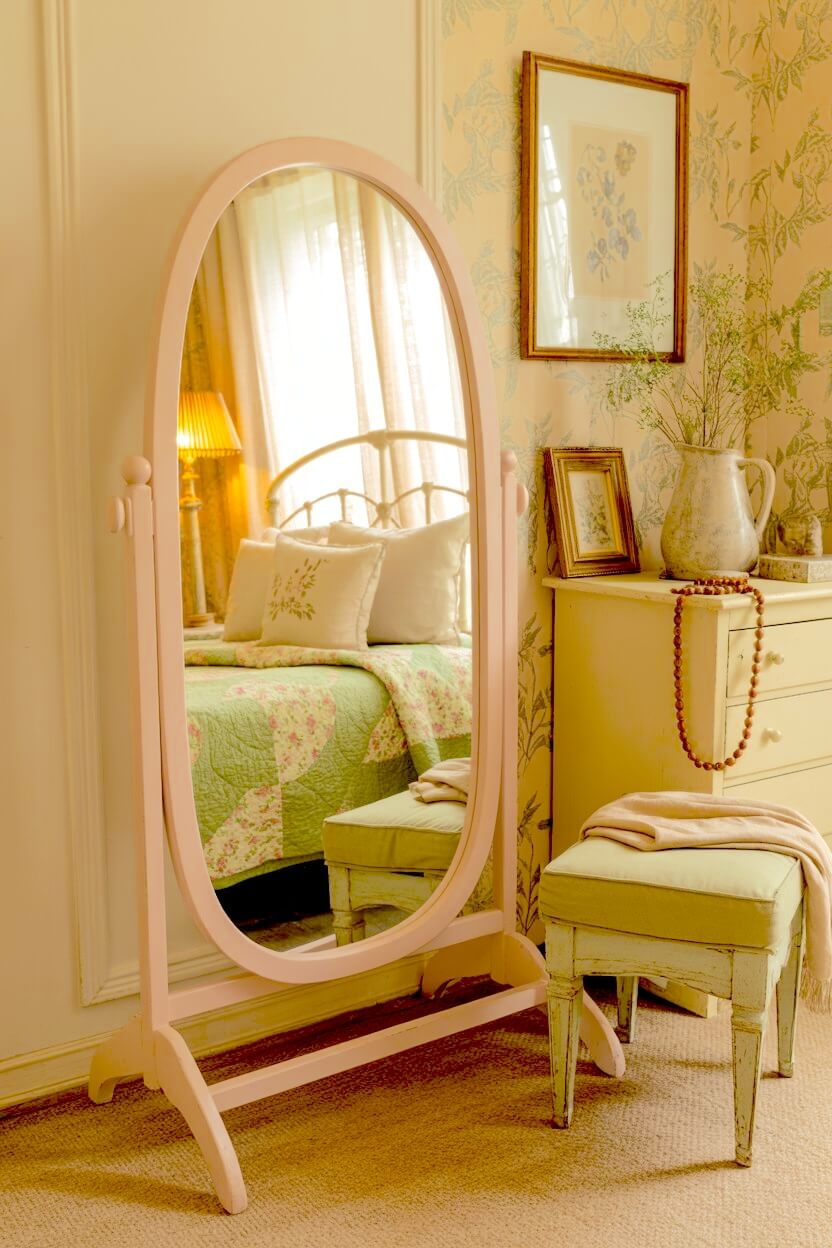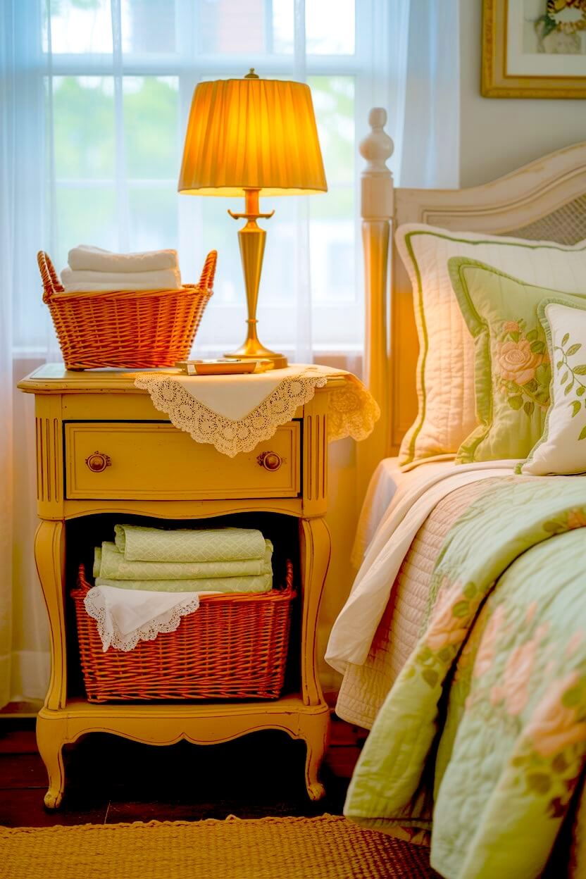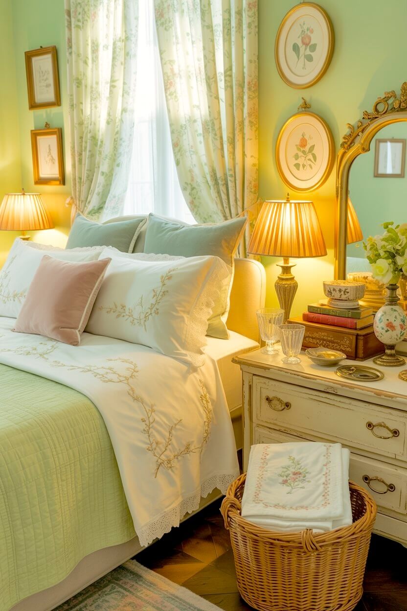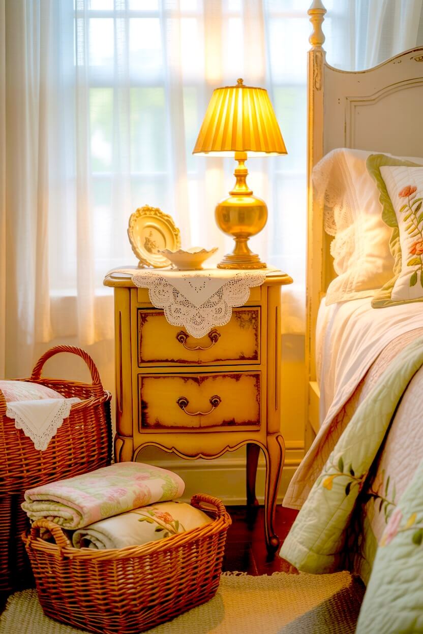 Cream-yellow curtains with soft florals, a vase of roses, a small gold frame, or a scalloped bedside dish — they all add that gentle nostalgic charm to your already-cozy room.
