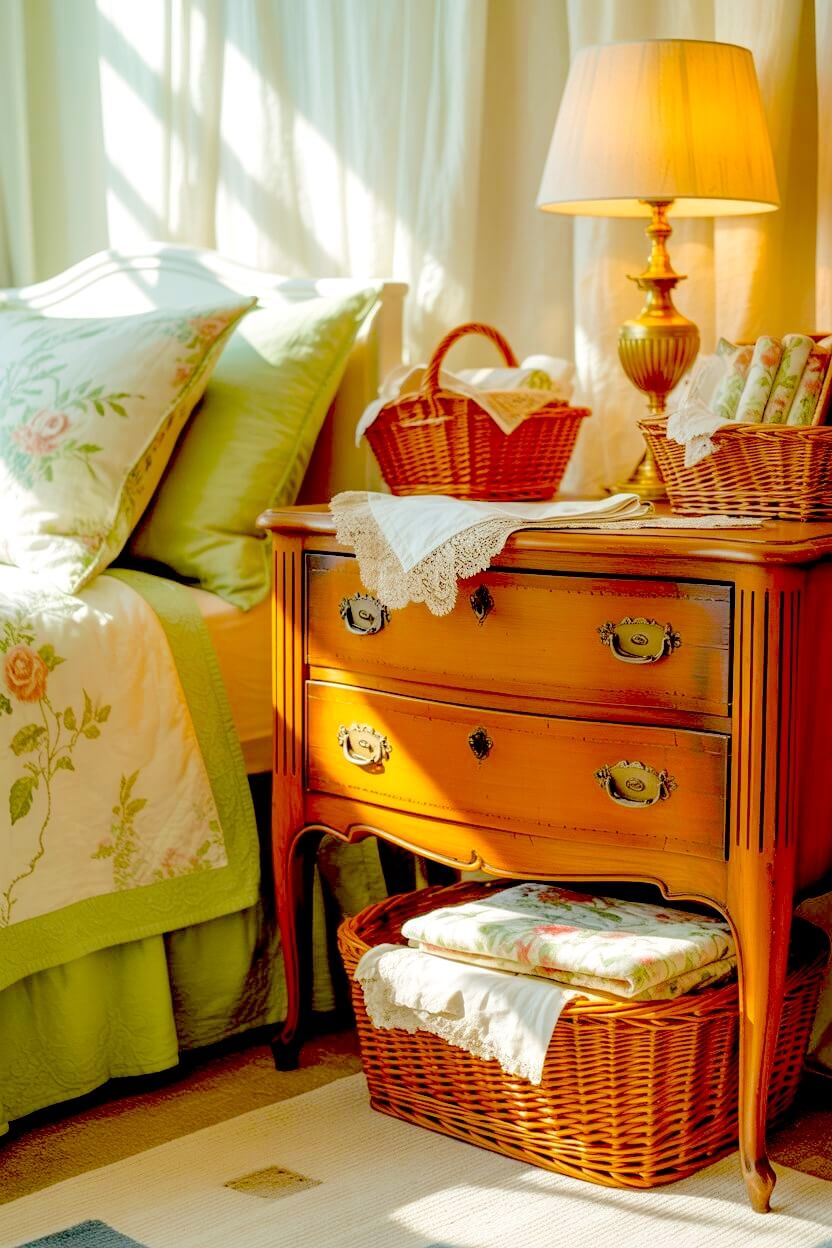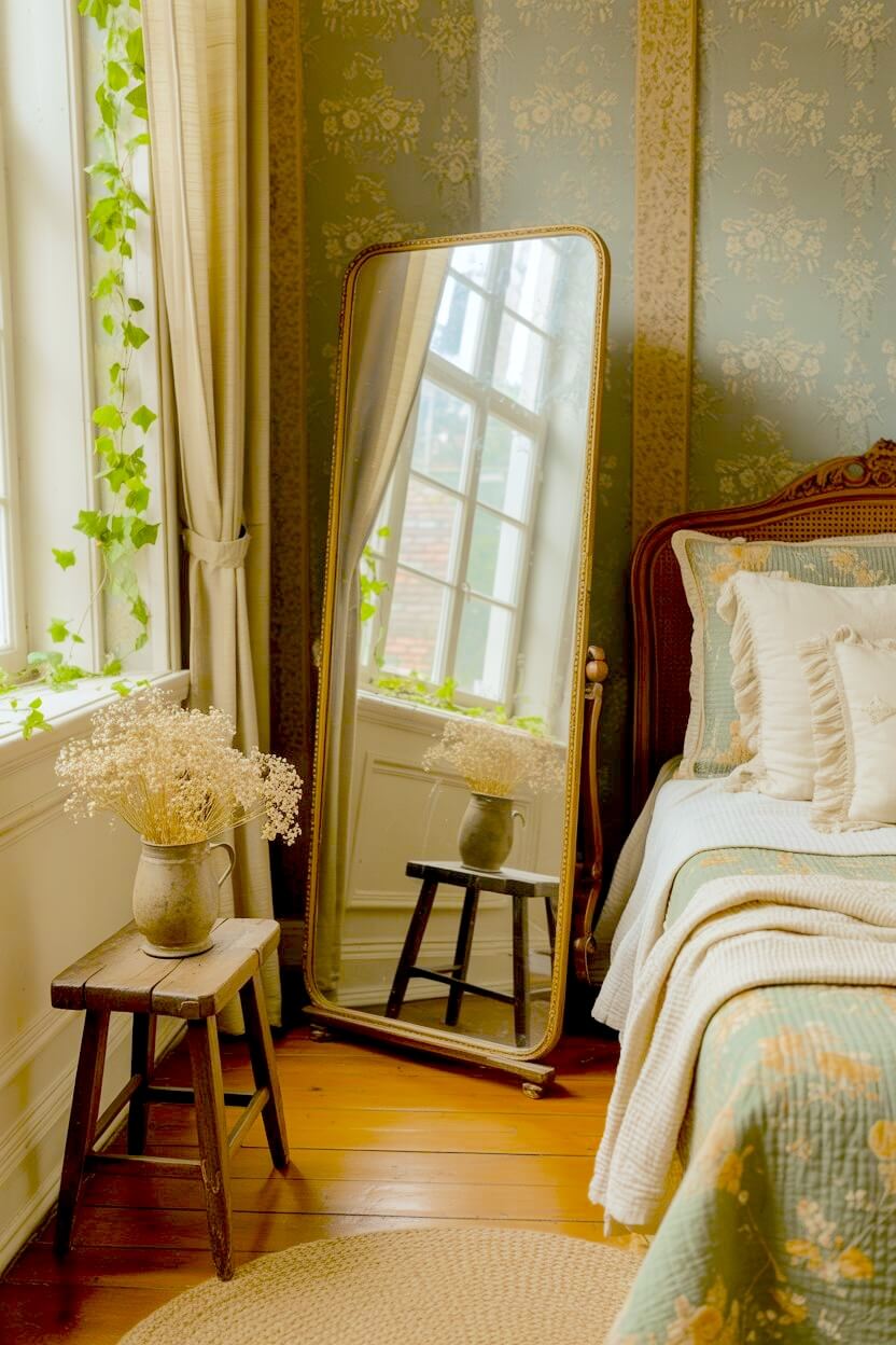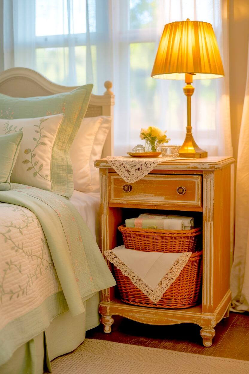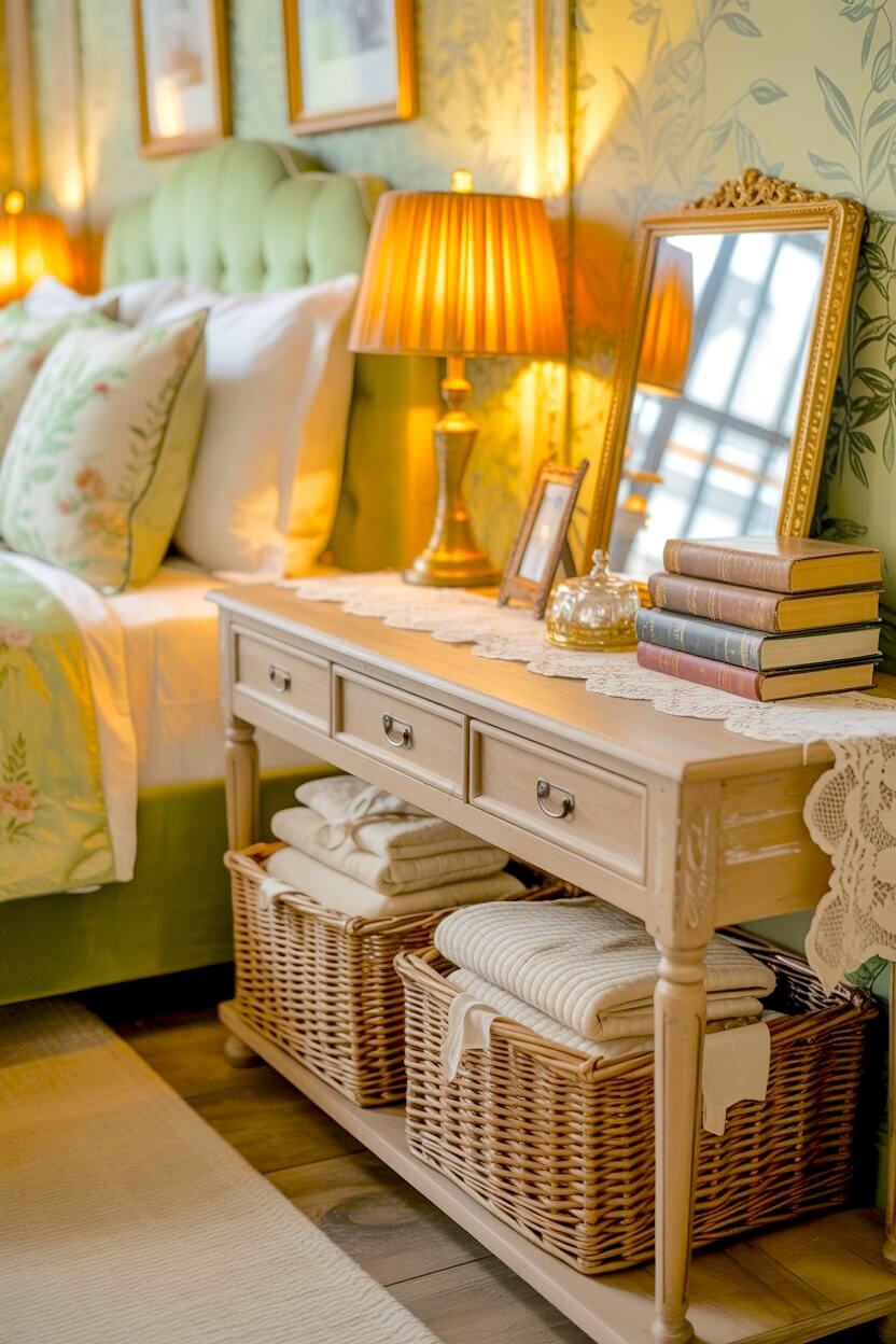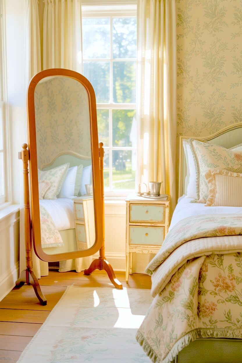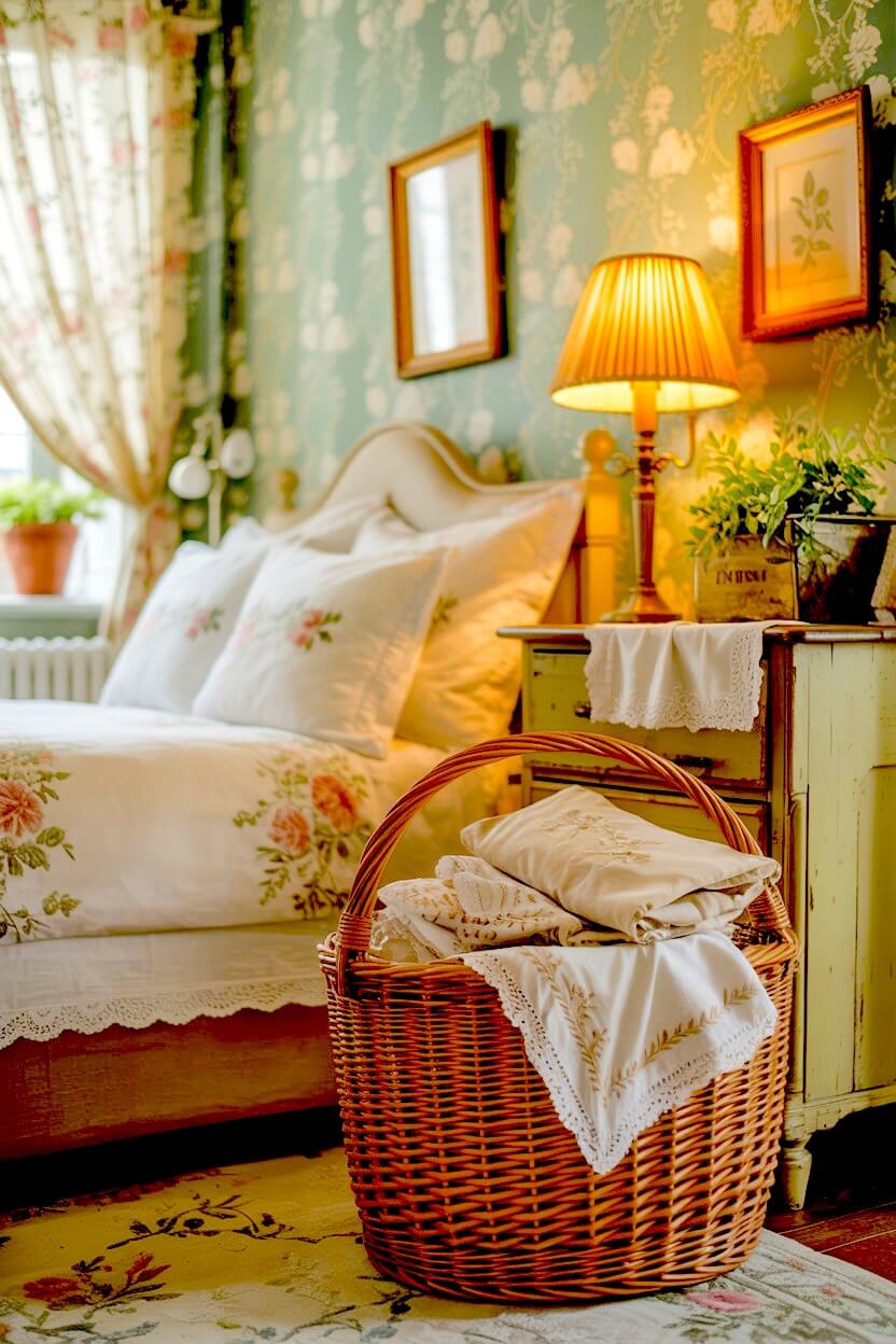Cream-yellow curtains with soft florals, a vase of roses, a small gold frame, or a scalloped bedside dish — they all add that gentle nostalgic charm to your already-cozy room.