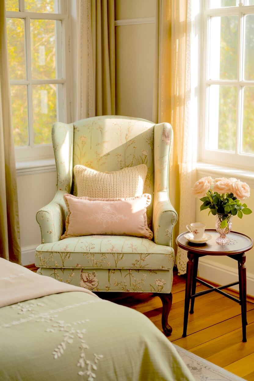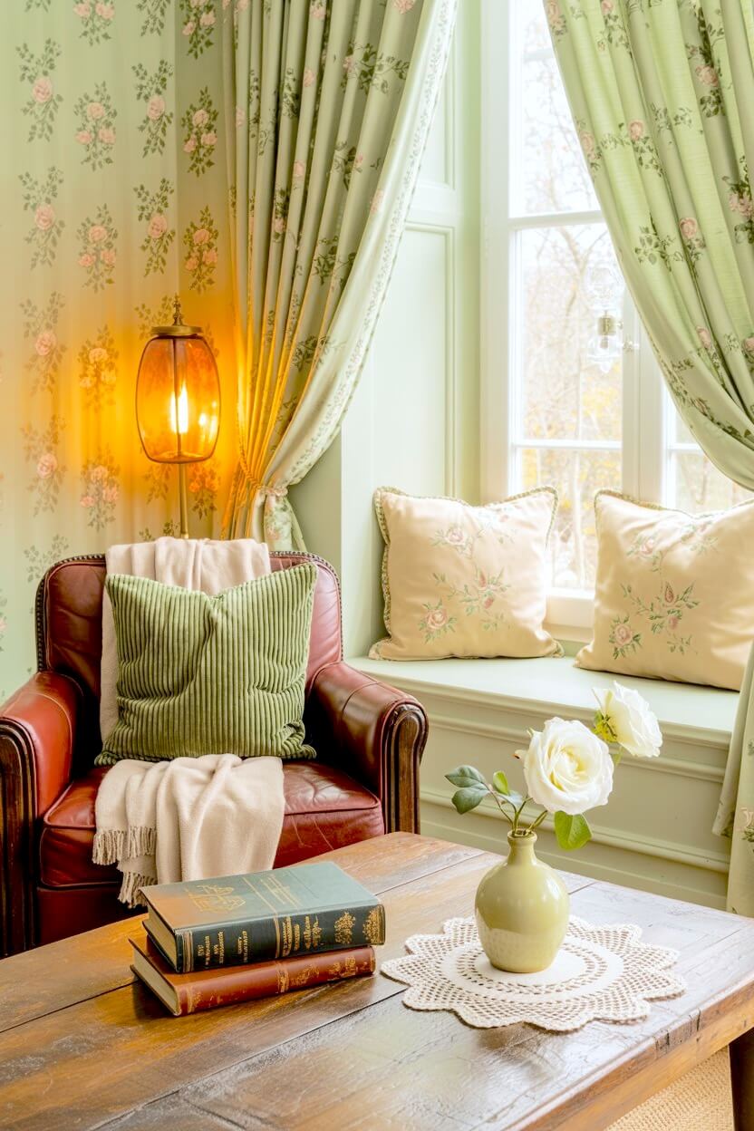The top choice for this look is a calming soft green. It pairs beautifully with powdery blush, warm ivory, soft cream, and those vintage rosy florals you find in old botanical books.