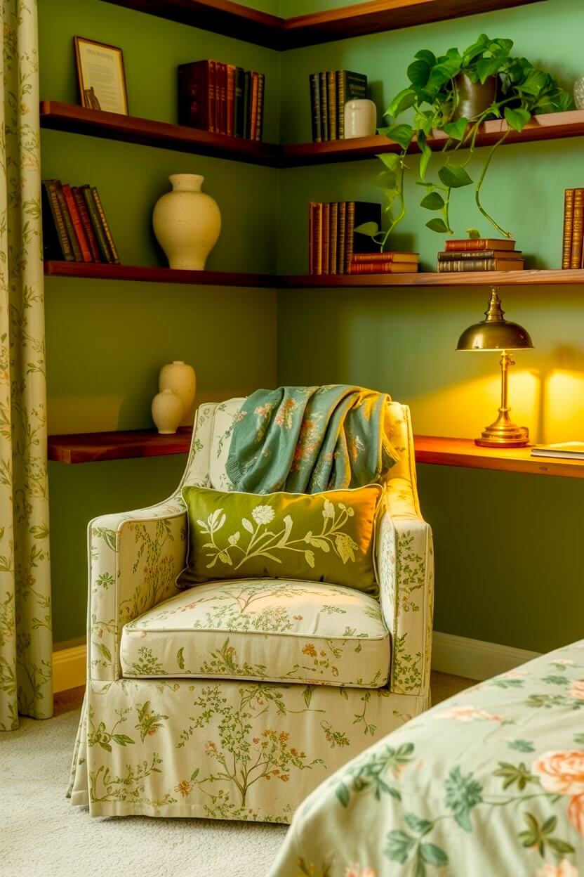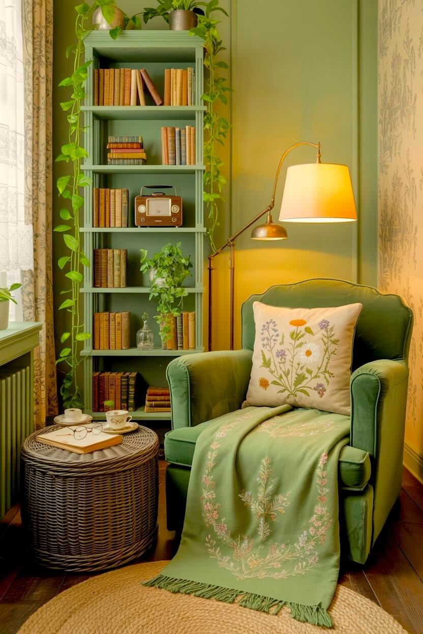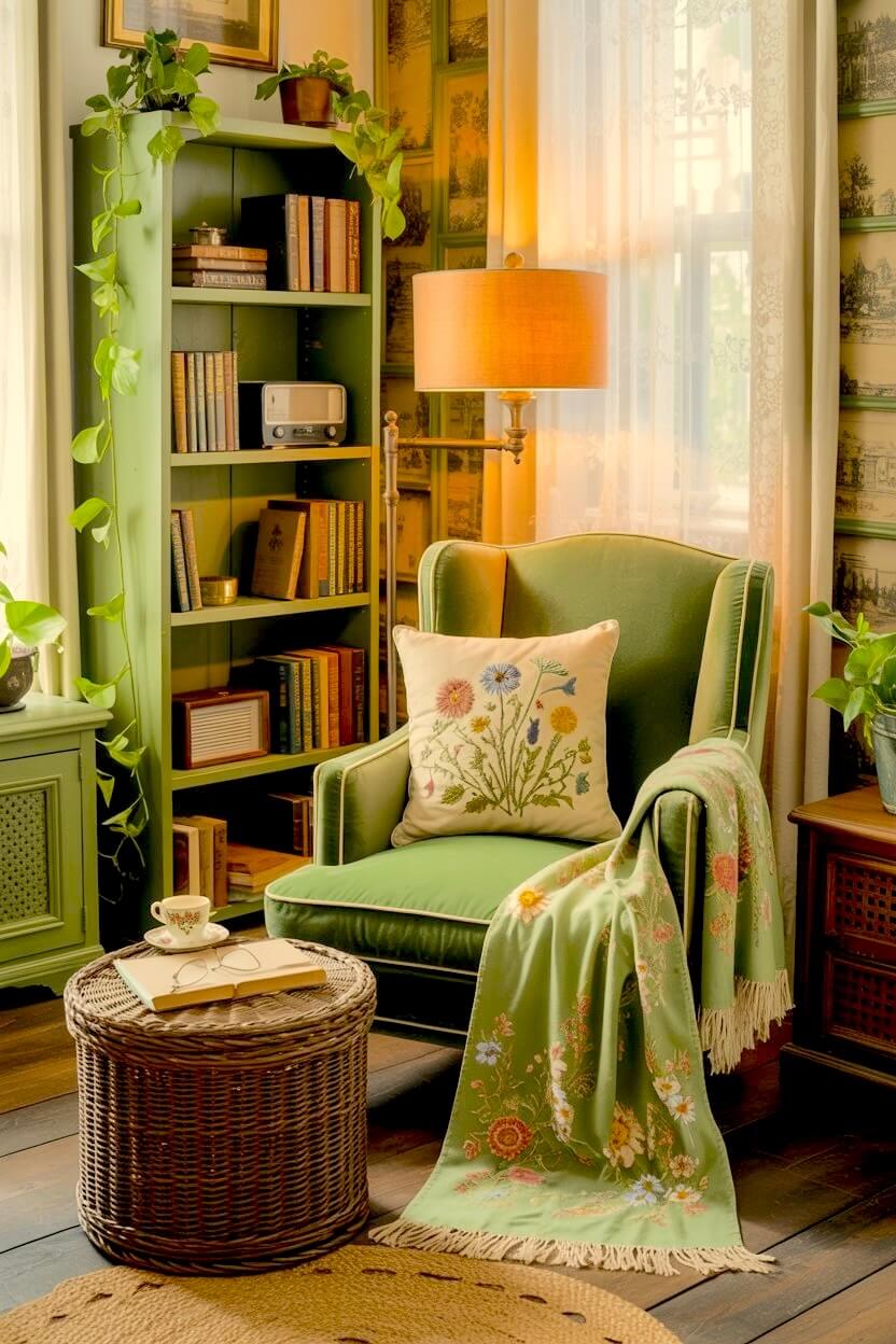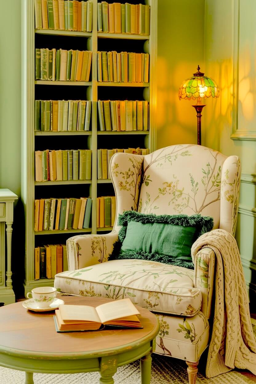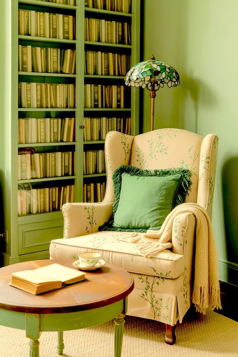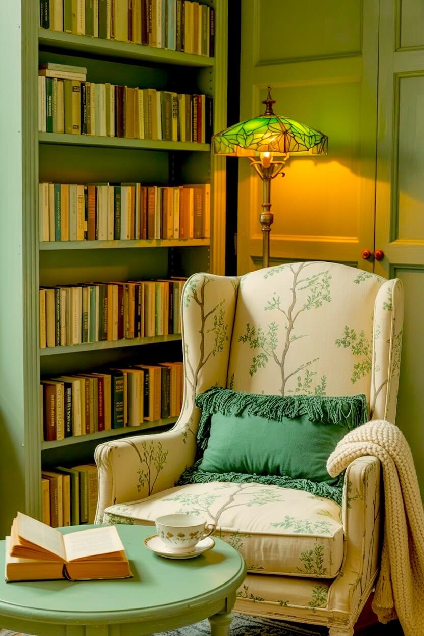 Among all the unconventional green grandmacore reading nook looks, this is the one I find most compelling.