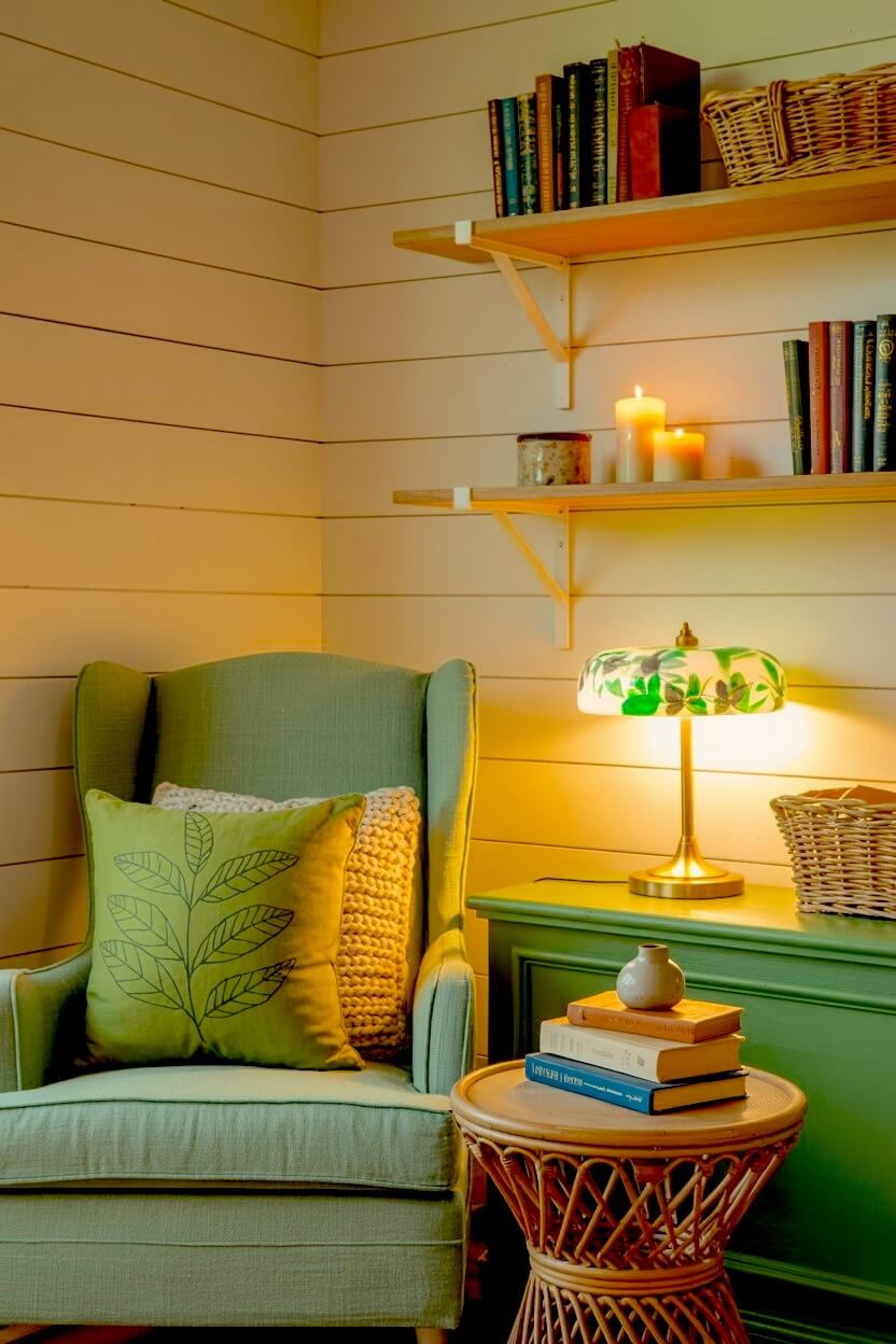 Rattan, willow, banana-leaf baskets, and woven side tables help the nook feel relaxed and settled. When choosing, go with the ones in warm walnut or honey tones. They’re perfect with green and give the nook a steady foundation before any pattern comes in.