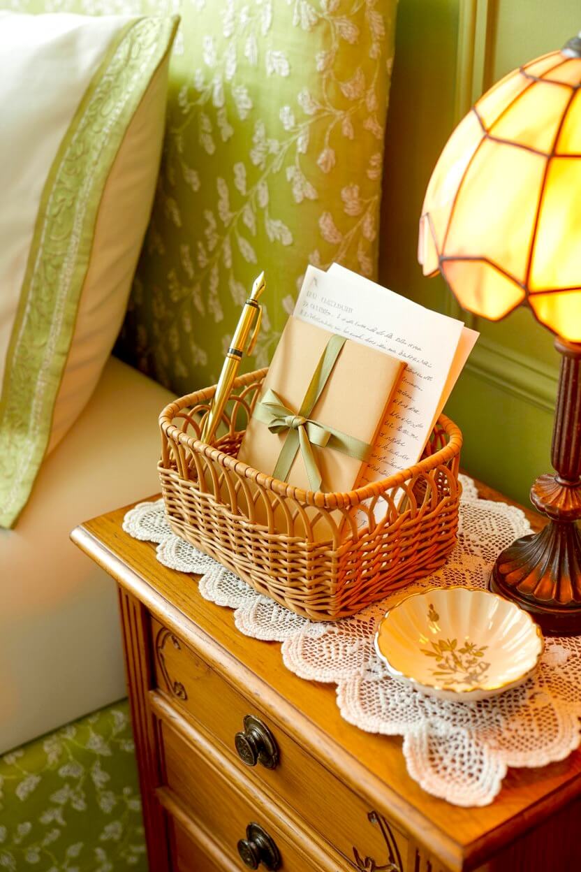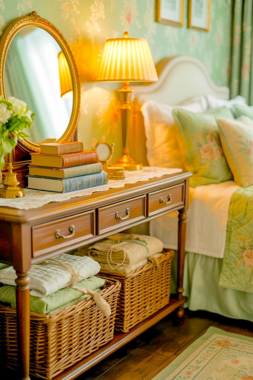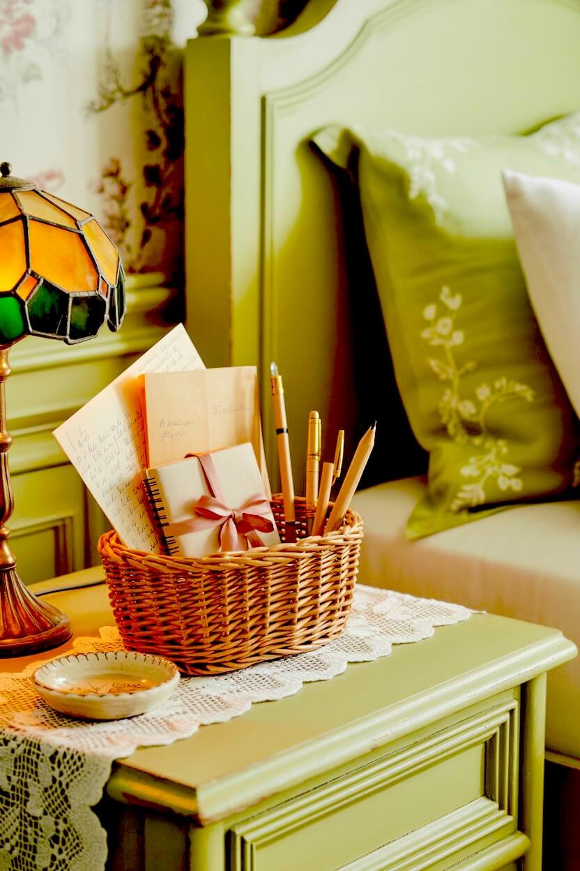 If you like, place a vase of soft green flowers or a delicate bedside dish to bring in more nostalgic, home-kept atmosphere.