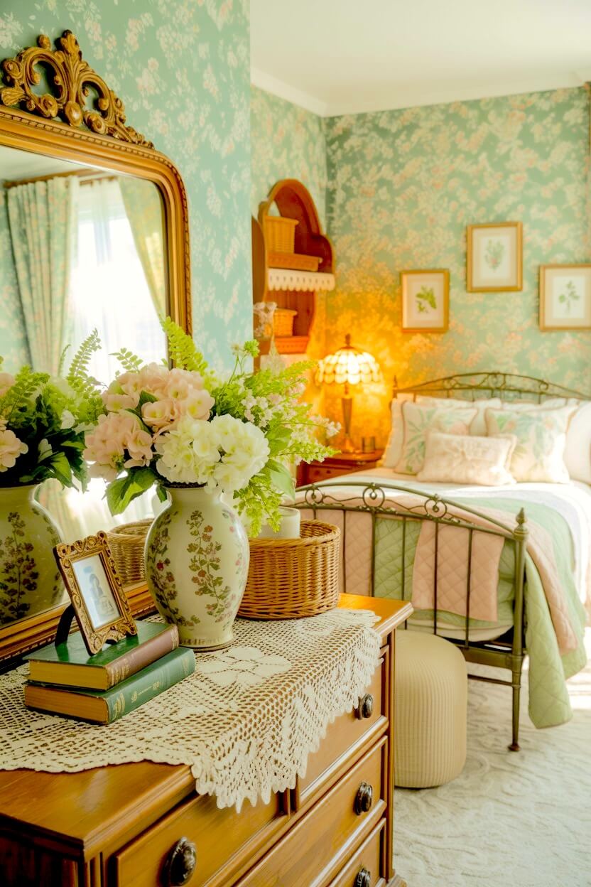 Keep the iconic grandmacore elements, then distribute them thoughtfully so the space feels cohesive rather than busy. I like starting with a calm green base tone and limiting florals and lace to just a few places: