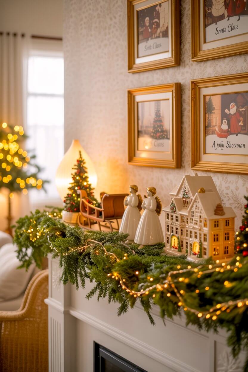 Style it with vintage figurines like reindeer, Santa Claus, or porcelain angels to create a mantel you”ll feel cozy sitting by.