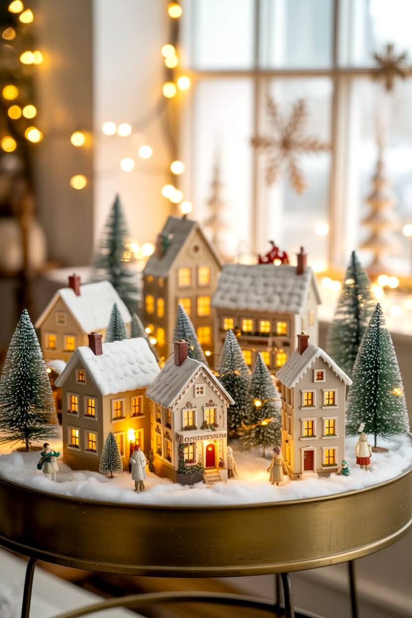 - Add glowing accents. Village houses, pre-lit wreaths, and string lights bring soft light that feels welcoming.